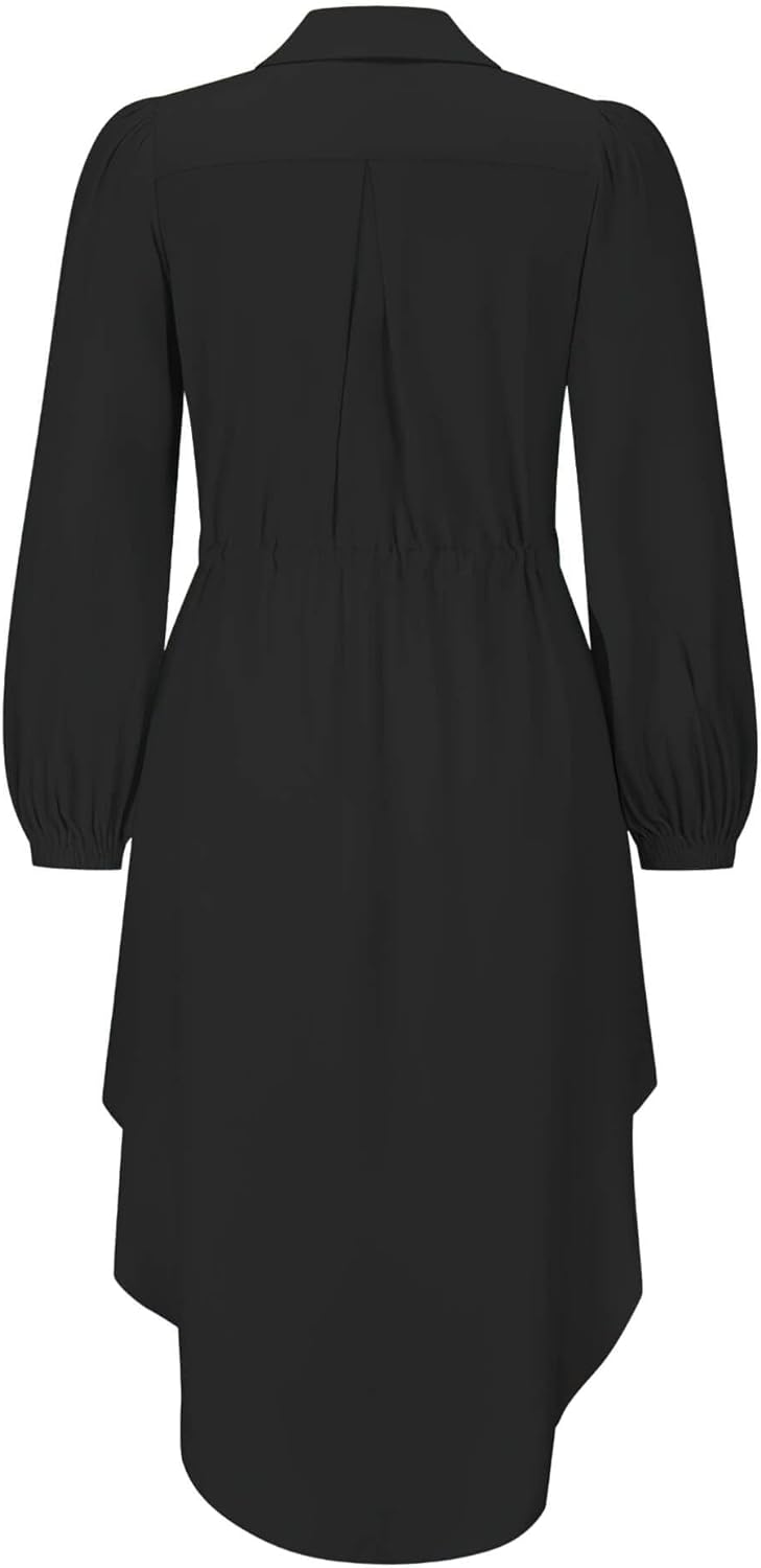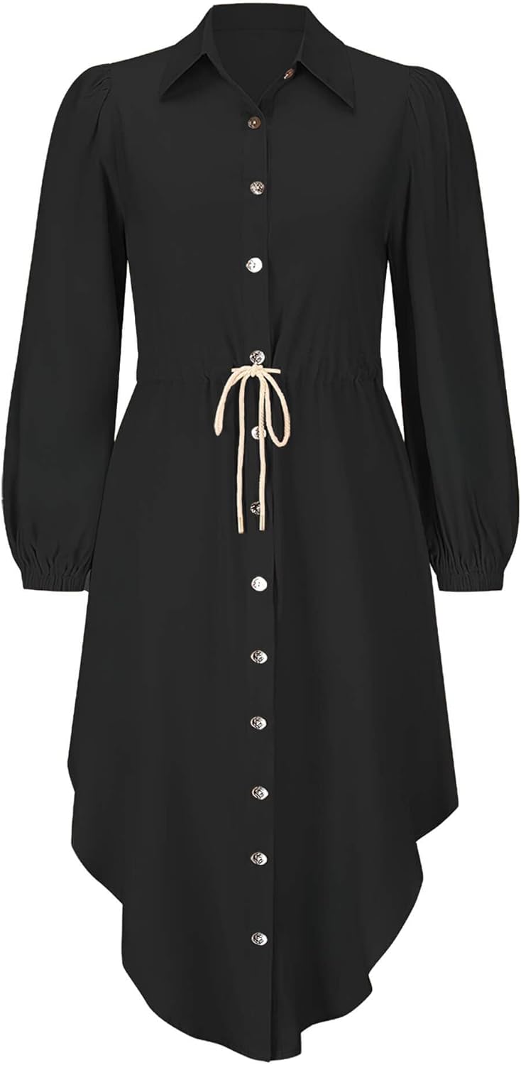 CHARTOU Women’s Elegant Lantern Sleeve Button Down Drawstring Midi Long Shirt Dress(Black)