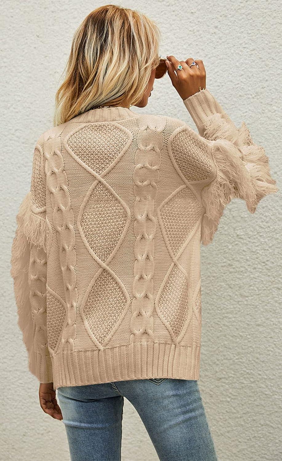 CHARTOU Women’s Elegant Long Sleeve Tassel Fringe Cable Knit Sweater Jumper Top(Beige)