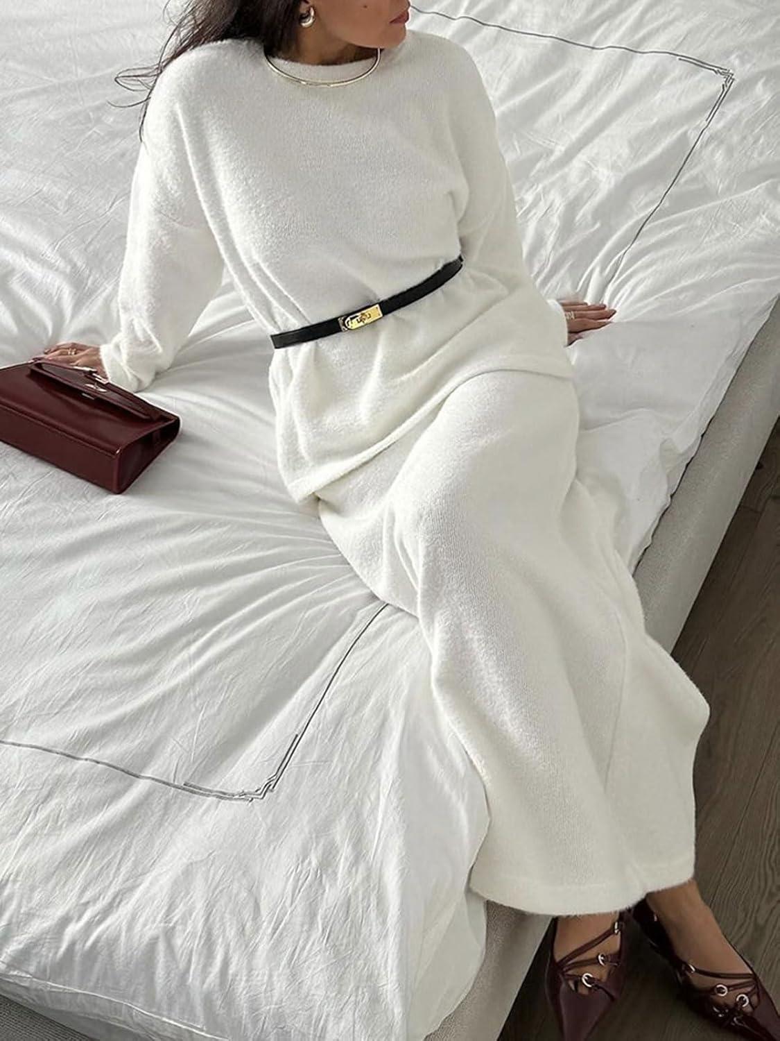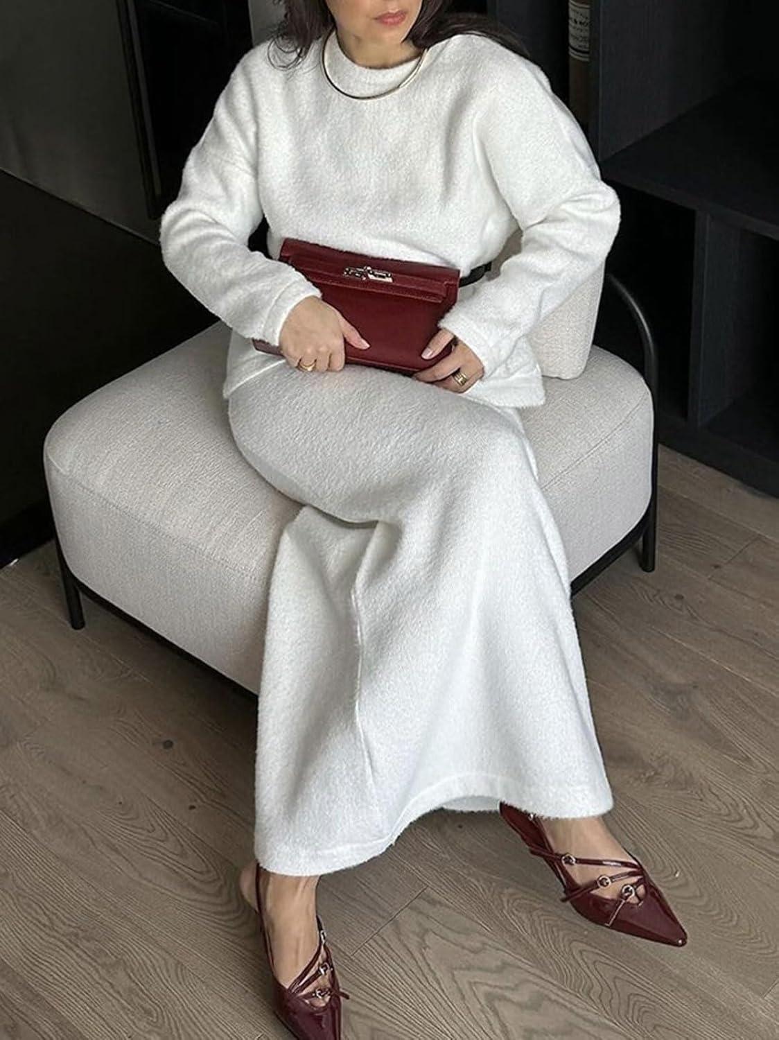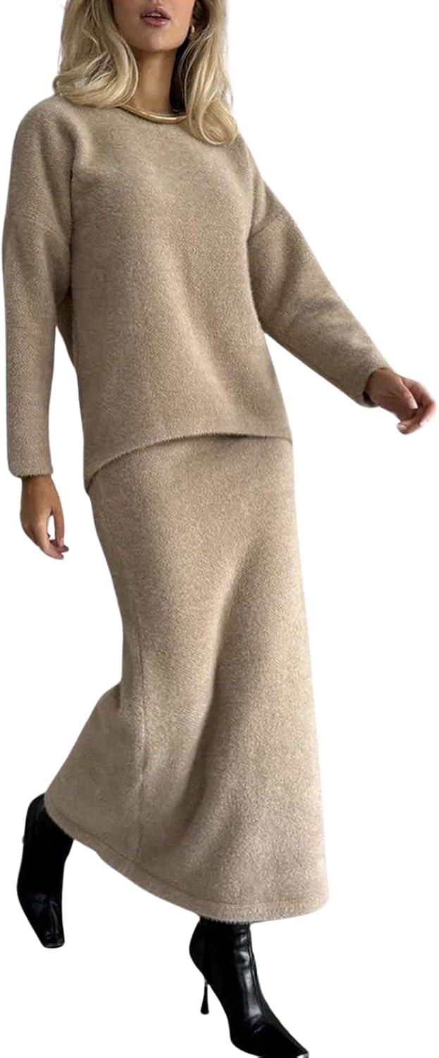 CHARTOU Women's Elegant Sweater Skirt Sets 2 Piece Outfits Fall Fuzzy Crewneck Sweater Fishtail Skirts Womens knit pullover sweater sets/ Dressy fishtail long skirts sets women Design: Pullover sweater sets featured on fuzzy ribbed knit sweater skirt sets, round neck, long sleeve, long sweater, hip-length, high-low hem, high waist, flowy ruffle skirts, elegant fishtail long skirt, ankle-length, OL style, solid color- dark grey, light grey, khaki, pink dressy skirt sets Casual Furry Two Piece Sets: Elegant crew neck knit sweater sets womens 2 pieces outfits fall/ Casual fuzzy long sleeve pullover sweater skirt sets for women dressy/ Trendy fishtail hem skirts sets womens winter/ Shaggy lounge sets two piece outfits womens/ High waist ruffle long skirts outfits Occasion: This dressy 2 piece outfits womens suit for lounge, dating, party, festive, streetwear, vacation, weekends, etc. Great match with pea coat, trench coat, high heels, boots Fuzzy knitted sweater dress fall outfits for women 2024 trendy crew neck sweater ruffle skirt sets womens dressy long sleeve pullover sweater two piece sets for women elegant fishtail hem maxi long skirts sets two piece outfits outwear