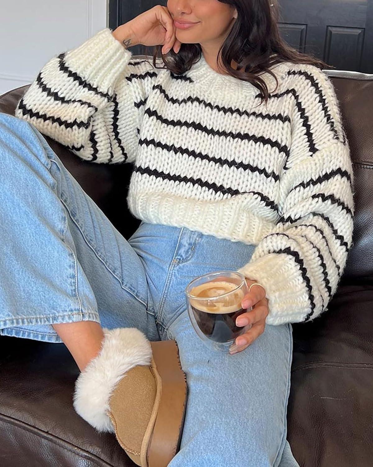 CHARTOU Womens Fall Cropped Sweater Chunky Knit Contrast Striped Winter Thick Sweater Pullover Cute Tops(Striped)