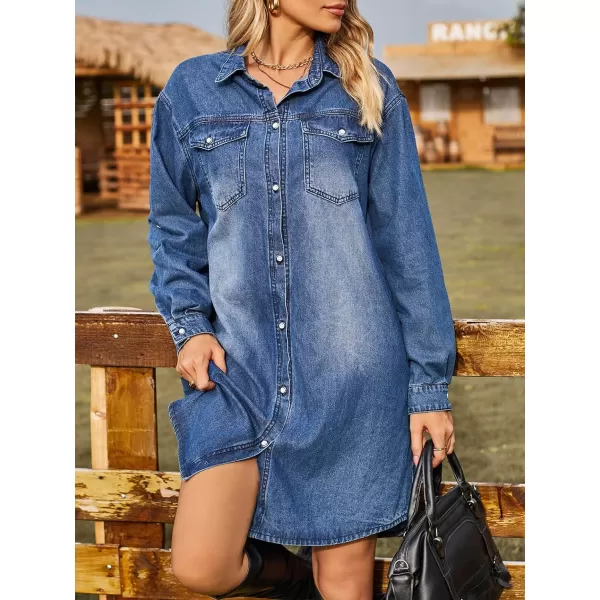 CHARTOU Women’s Fall Lightweight Lapel Collar Washed Denim Button Down Shirt Dress Long Jean Jacket Coat(Dark Blue)