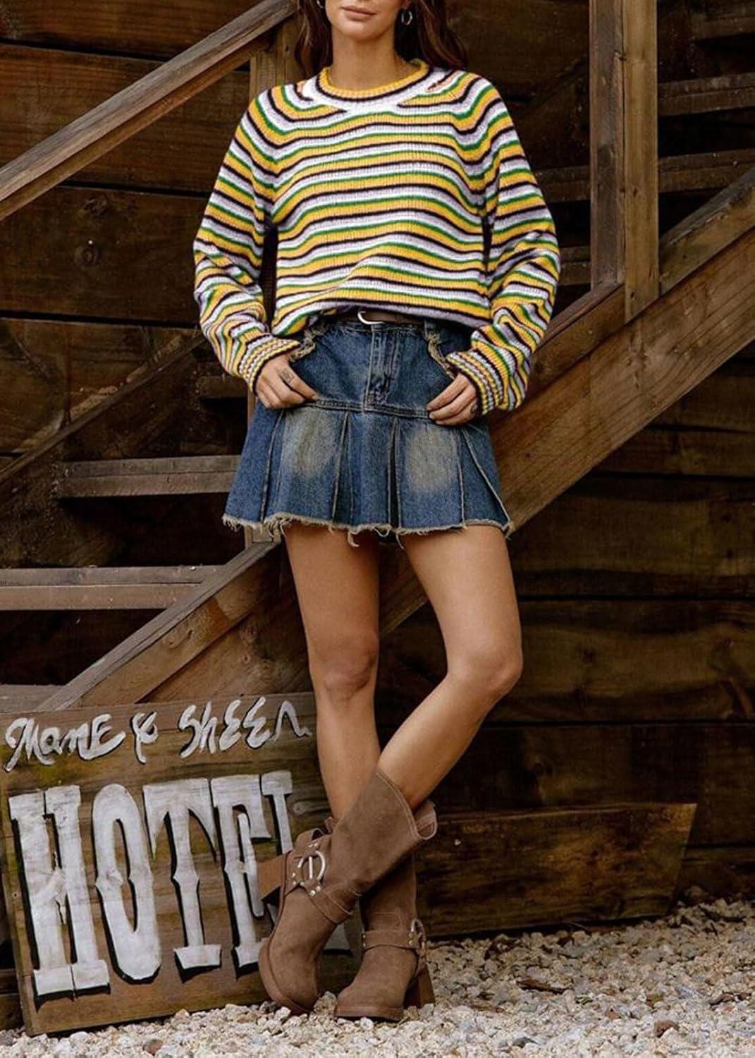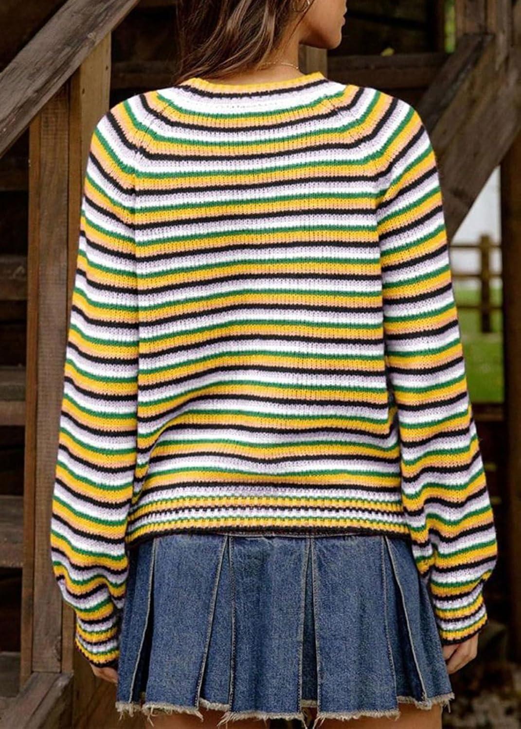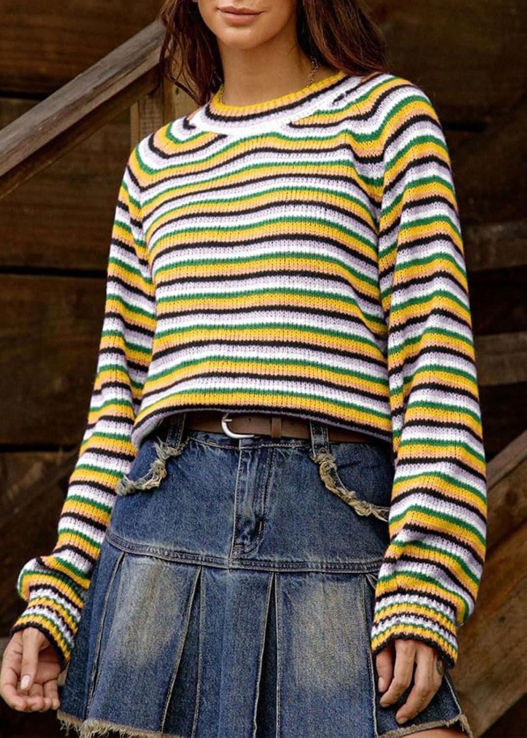 CHARTOU Women’s Fall Oversized Pullover Sweater Colorful Striped Lightweight Y2K Retro Crewneck Jumper Tops(Yellow)