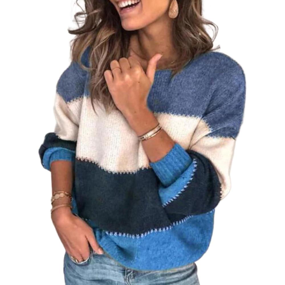 CHARTOU Womens Fall Sweaters Contrast Striped Knit Pullover Sweater Oversized Sweatshirt Casual Outwear(Blue)