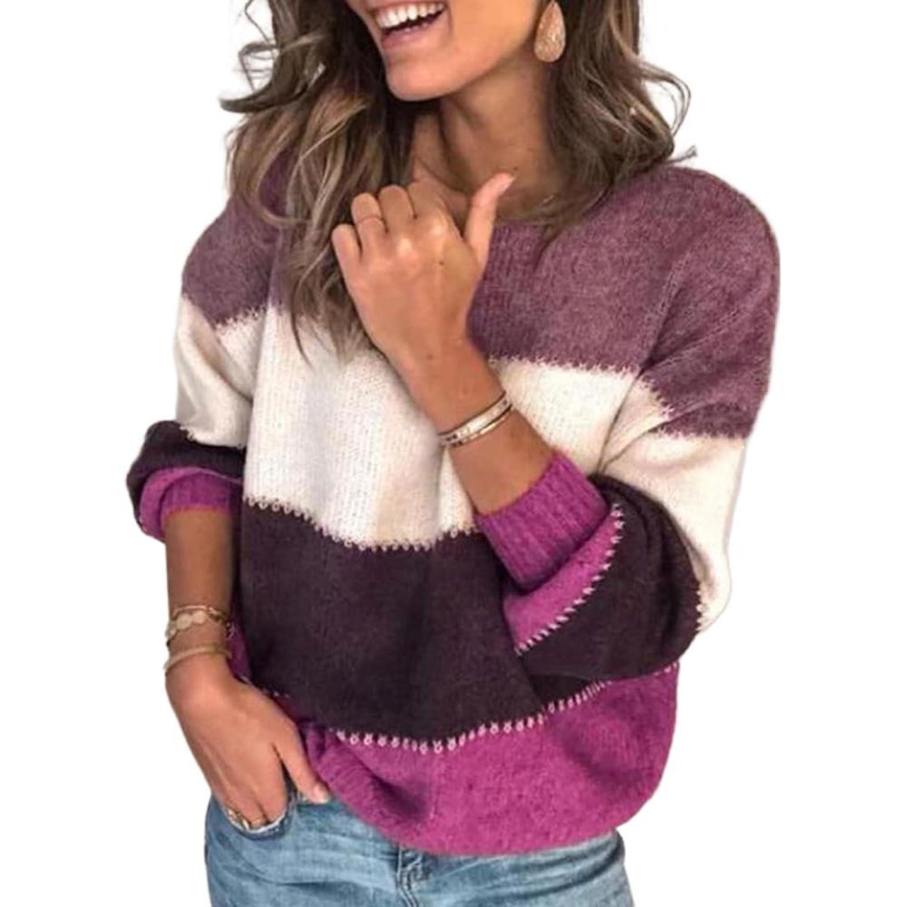 CHARTOU Womens Fall Sweaters Contrast Striped Knit Pullover Sweater Oversized Sweatshirt Casual Outwear(Purple)