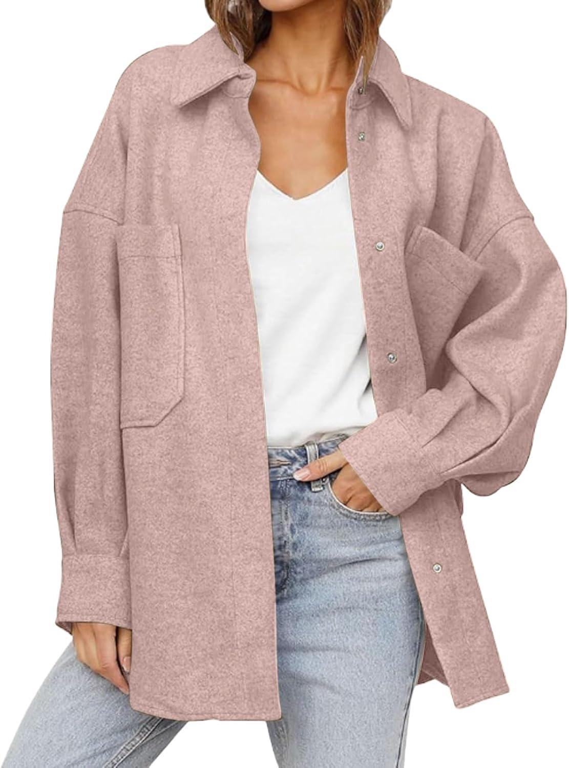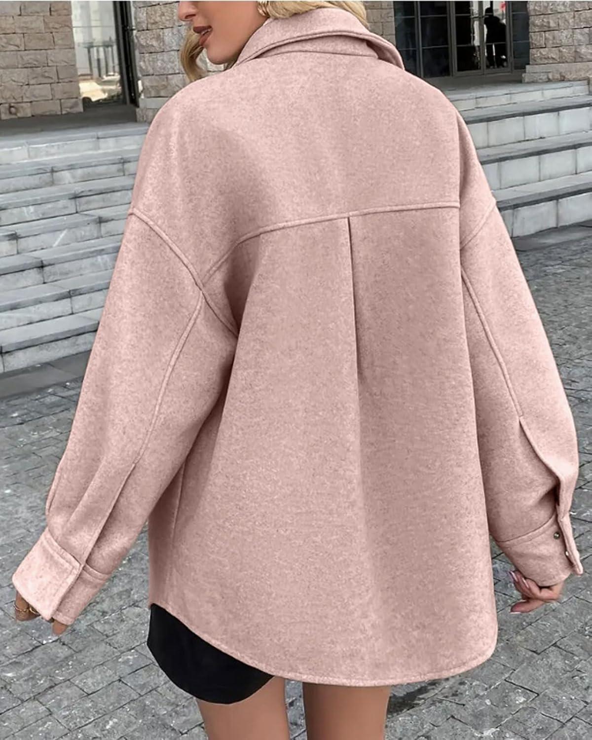 CHARTOU Women’s Fall Thicken Shirt Jacket Wool Lapel Snap Button Mid Long Casual Work Coat with Pockets(Pink)