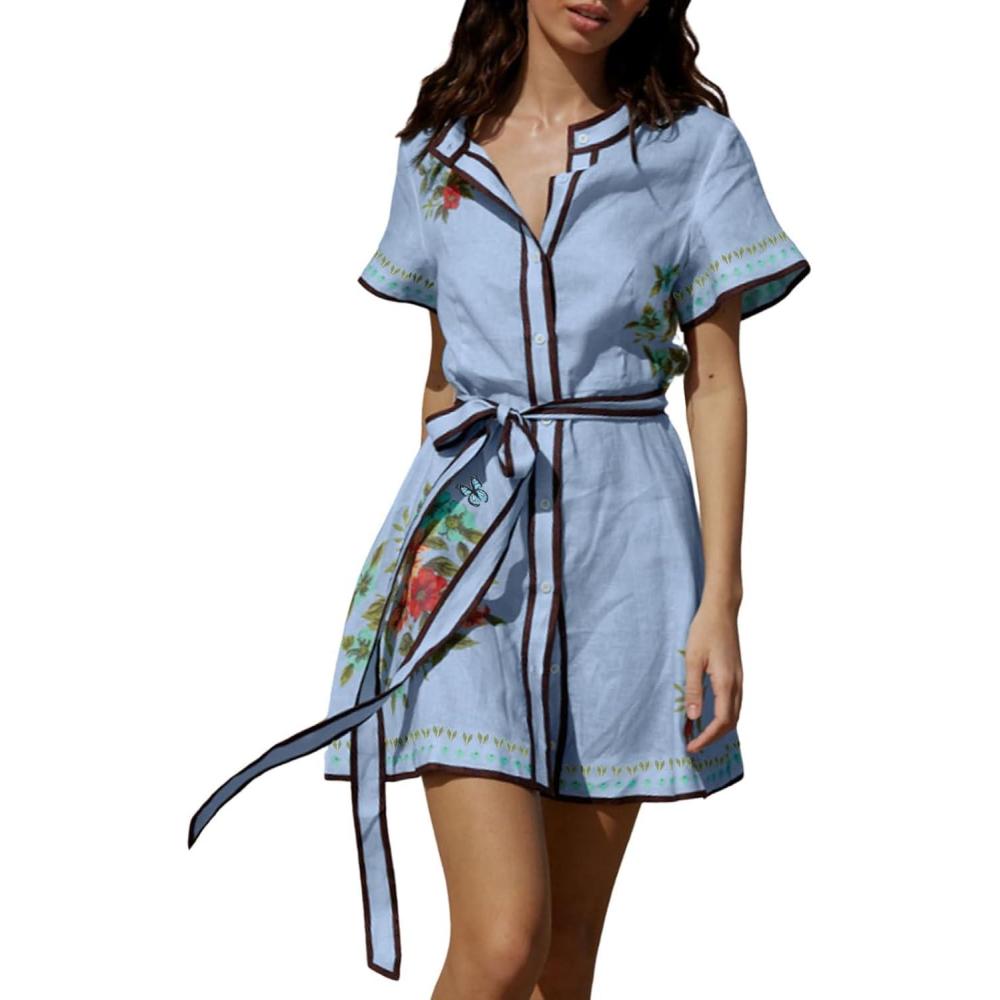 CHARTOU Women's Floral Linen Button Down Wrap Tie Knot Boho Beach Shirt Dress with Belt Women summer short sleeve contrast trim y2k sundresses Feature for Casual Beach Short Dress: Womens tropical mini dress featured on classic v neckline and short sleeve design, button down closure, a line silhouette, summer boho beach short dress, contrast trim, floral print, 1 belt, wrap dress, lace up blue shirt dress, floral print Women Boho Floral Shirt Dress: Women A line mini dress with contrast trim/ Summer wrap beach coverup dress/ Casual linen shirt dress with belt/ Button down shirt dress woman/ Colorful short sleeve dresses for women trendy/ Floral beach dress with belt/ Tropical boho lace up wrap dress/ Crew neck blue y2k dress Women short sleeve linen shirt dress wrap beach lace up sun dress with belt patchwork cute y2k floral a line mini dresses for women trendy summer tropical button up tunic dress boho colorful graffiti dress
