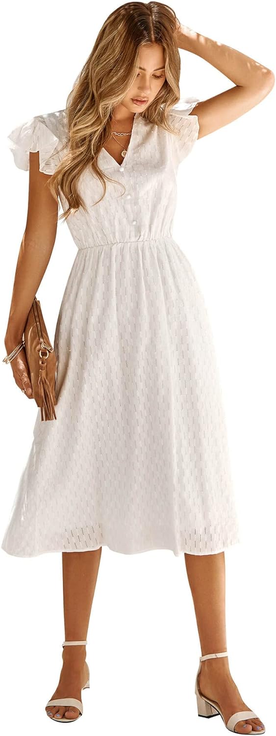CHARTOU Women’s Flutter Sleeve V-Neck High Waist A-Line Flowy Midi Long Dress(White)