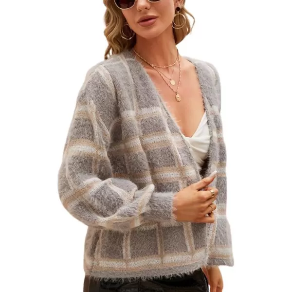 CHARTOU Women’s Furry Mohair Jacket Plaid Lantern Long Sleeve Open Front Cardigan Sweater(Light Grey)