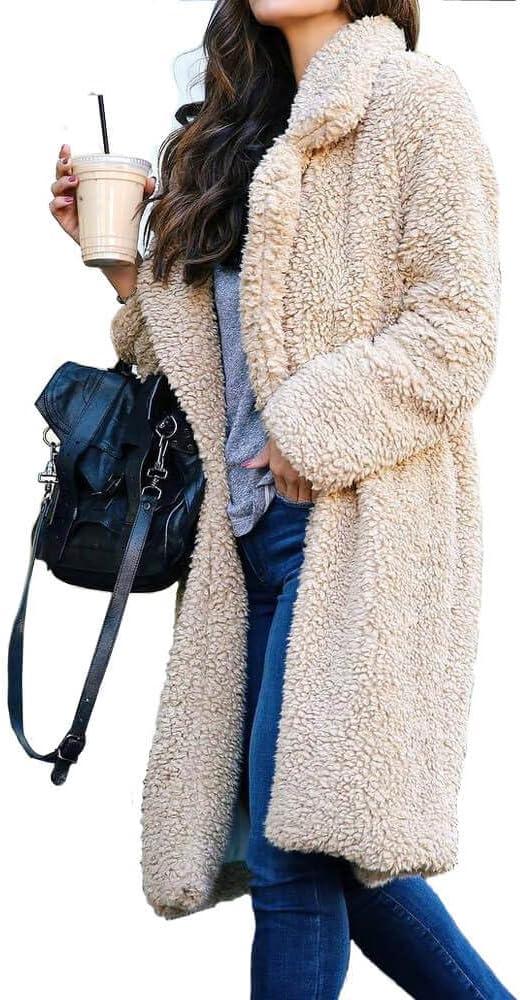 CHARTOU Women’s Fuzzy Sherpa Fleece Notched Lapel Oversized Overcoat Trench Coat(Apricot)
