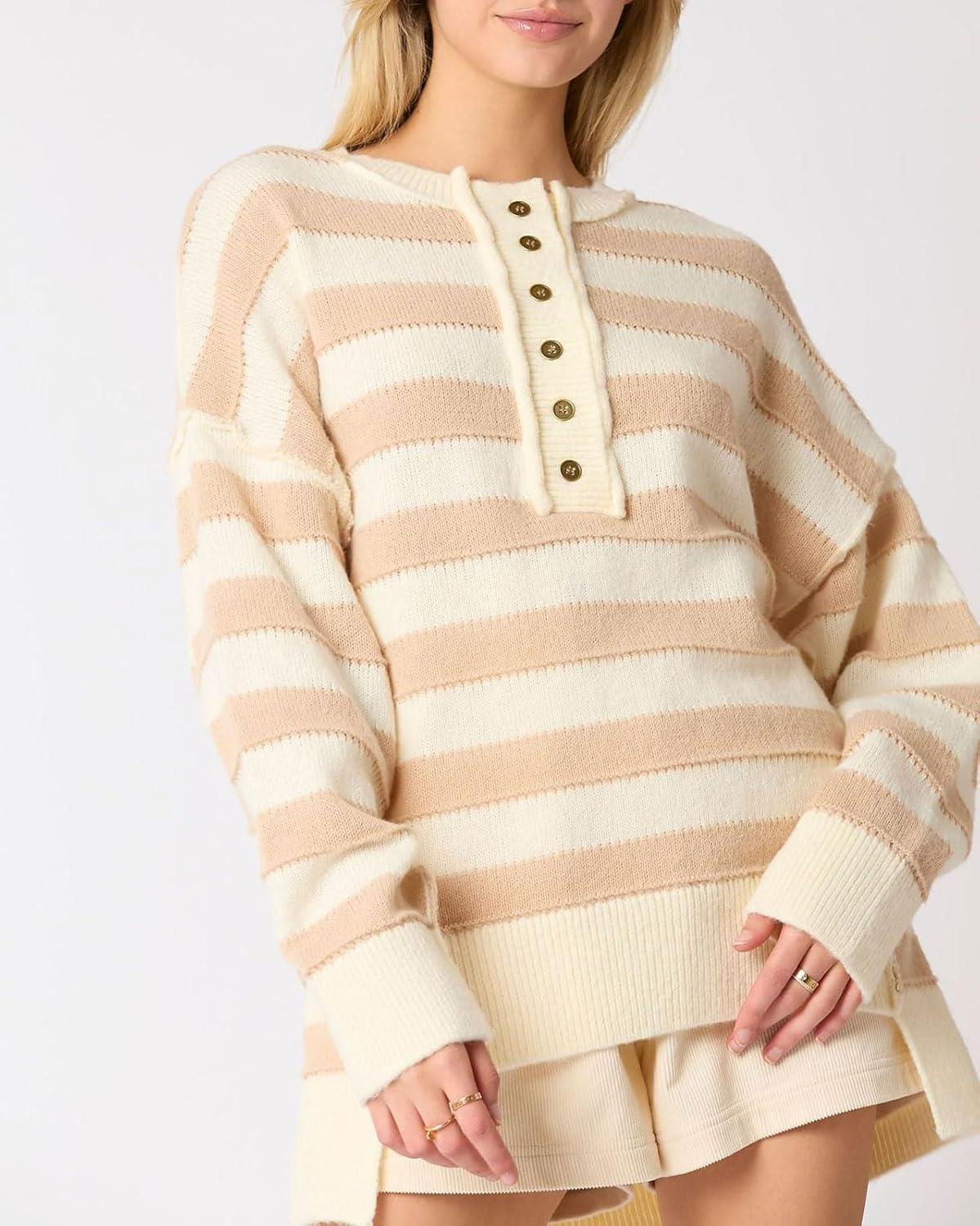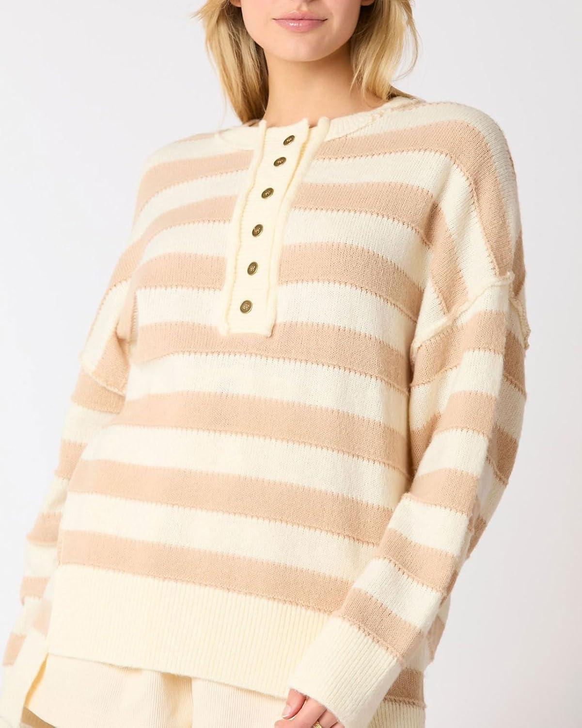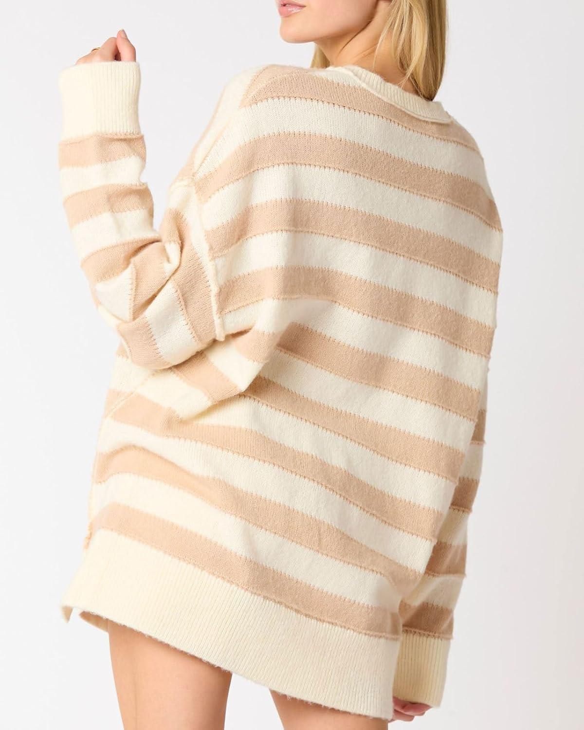 CHARTOU Women’s Half Buttons Pullover Sweater Oversized Contrast Striped Knit Y2k Fall Sweater Jumpers(Khaki)