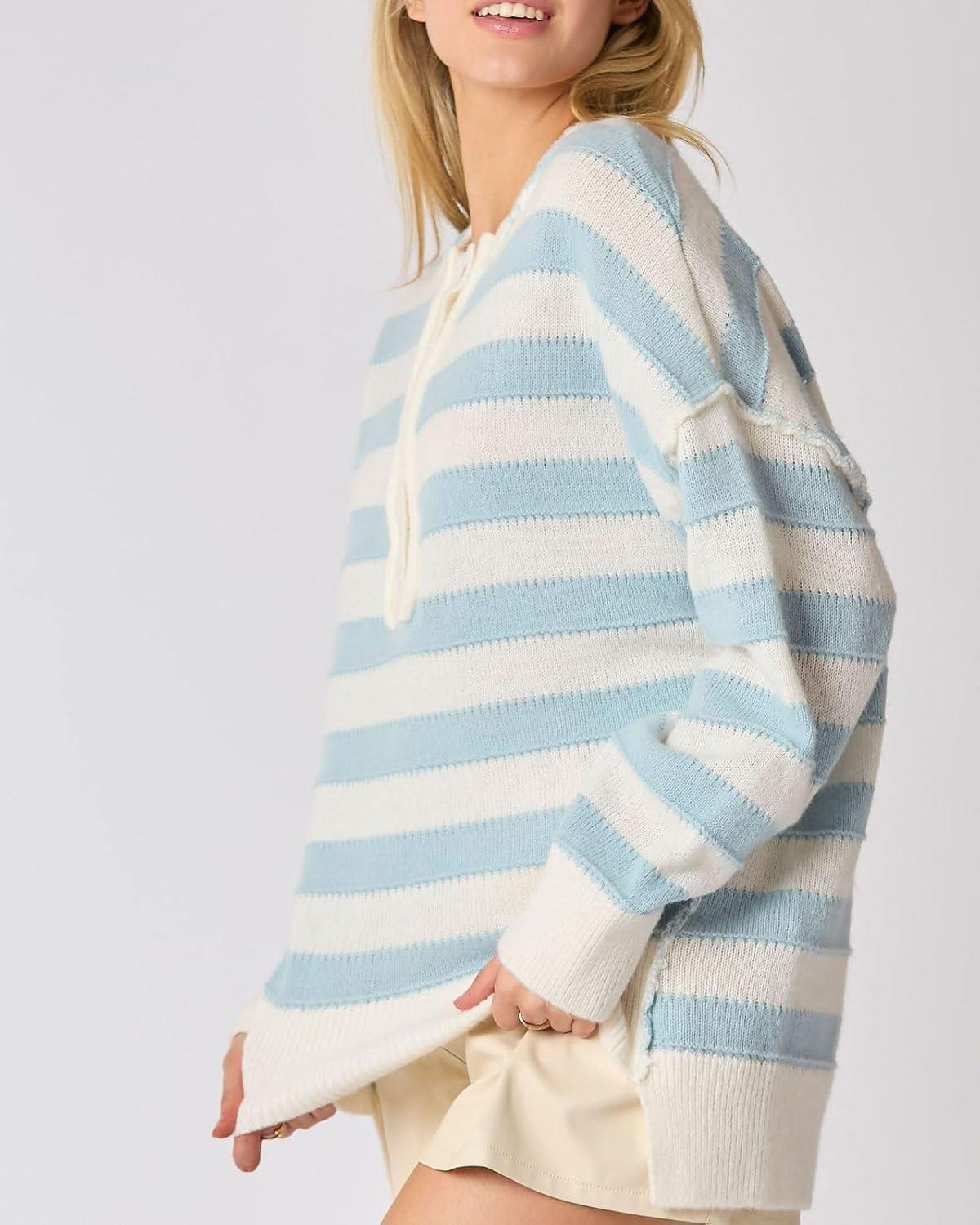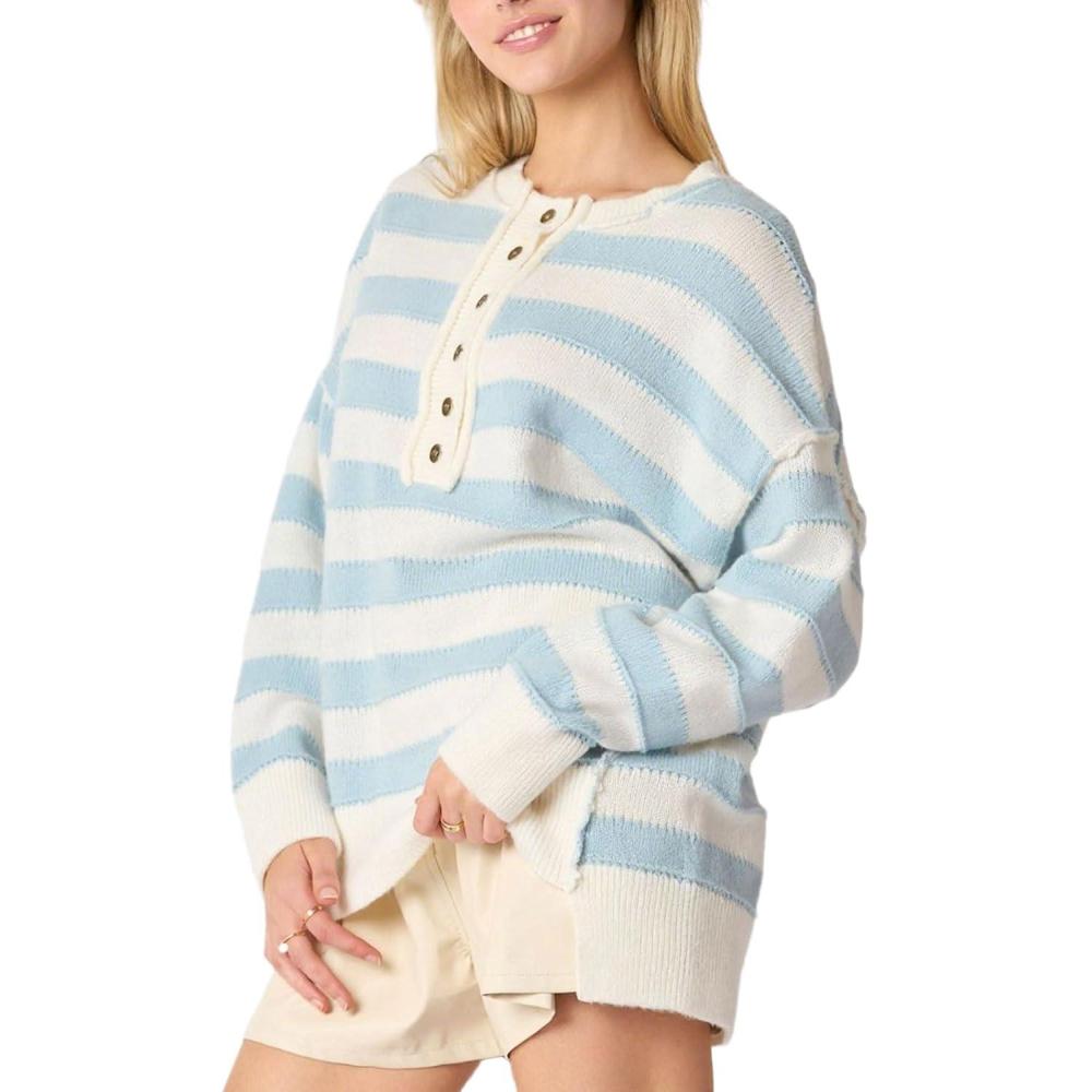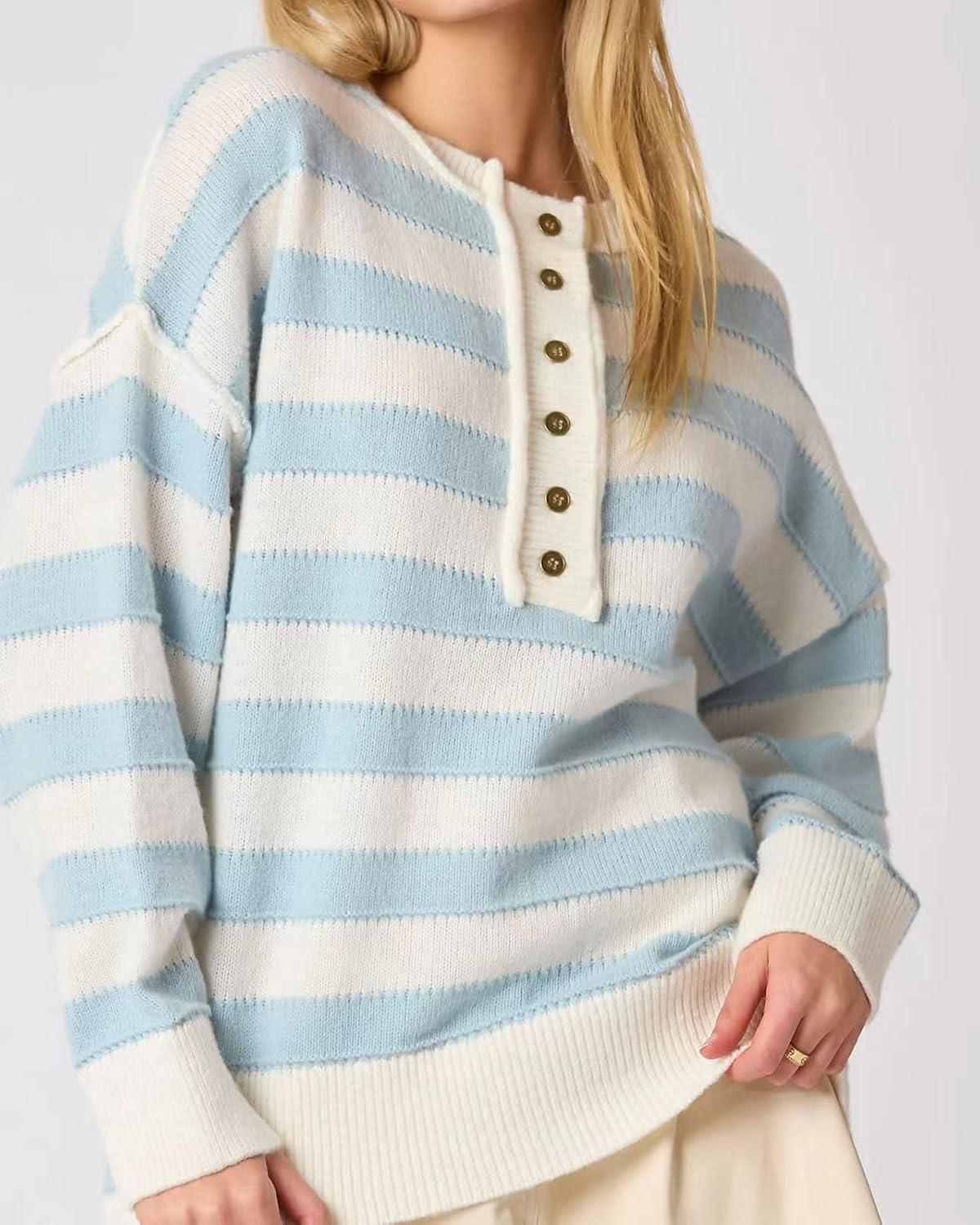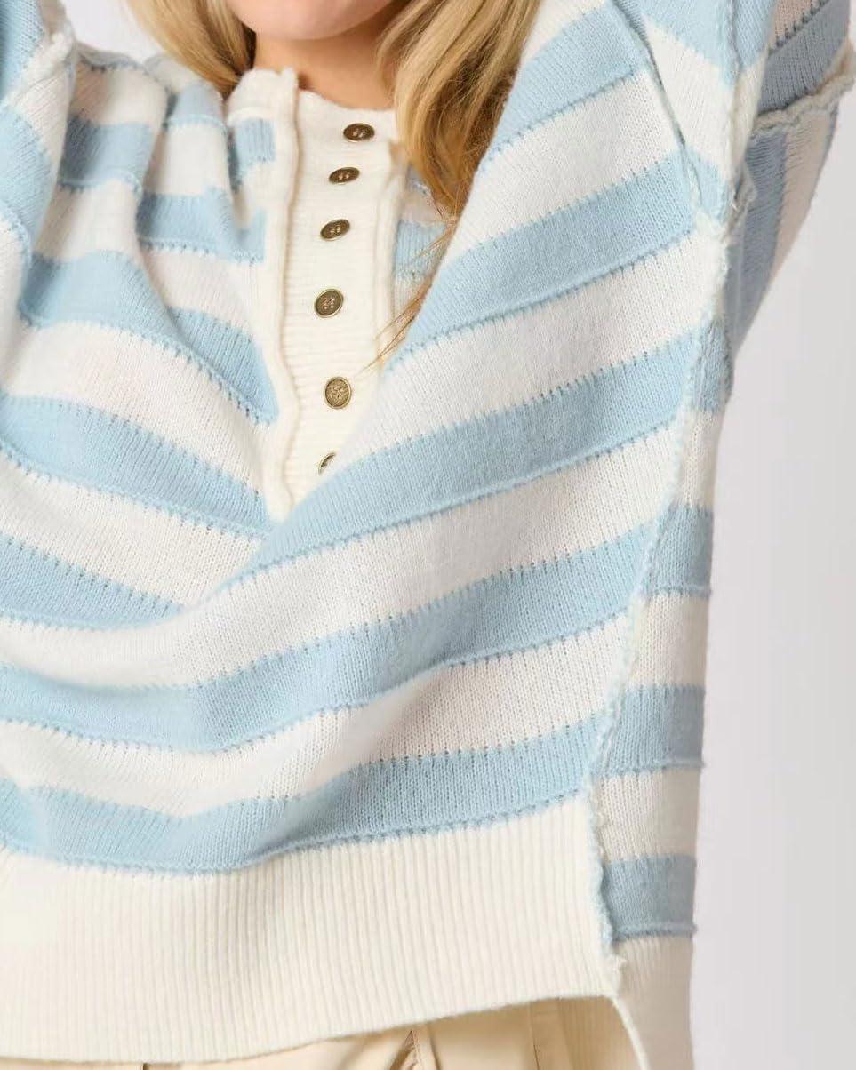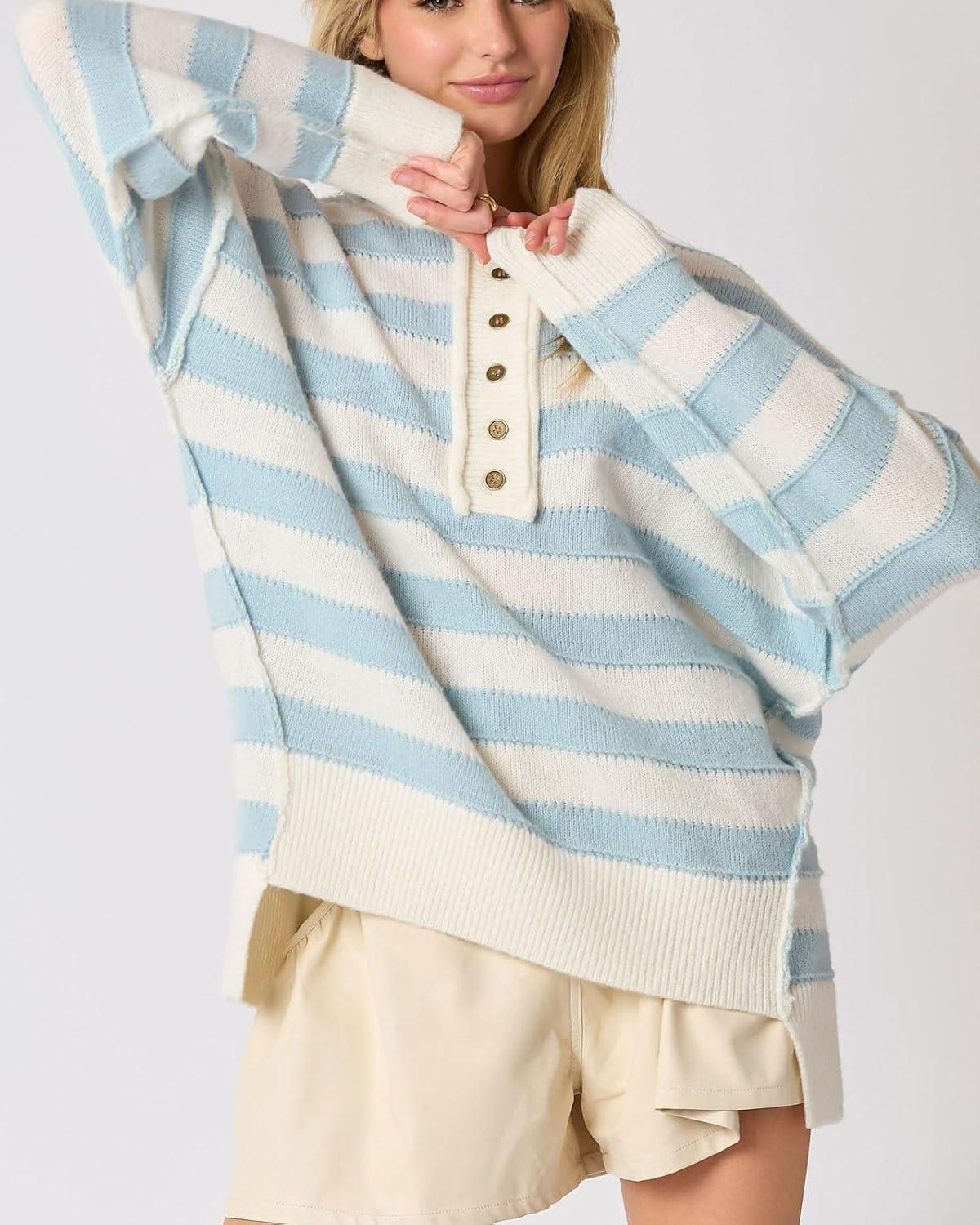 CHARTOU Women’s Half Buttons Pullover Sweater Oversized Contrast Striped Knit Y2k Fall Sweater Jumpers(Light Blue)