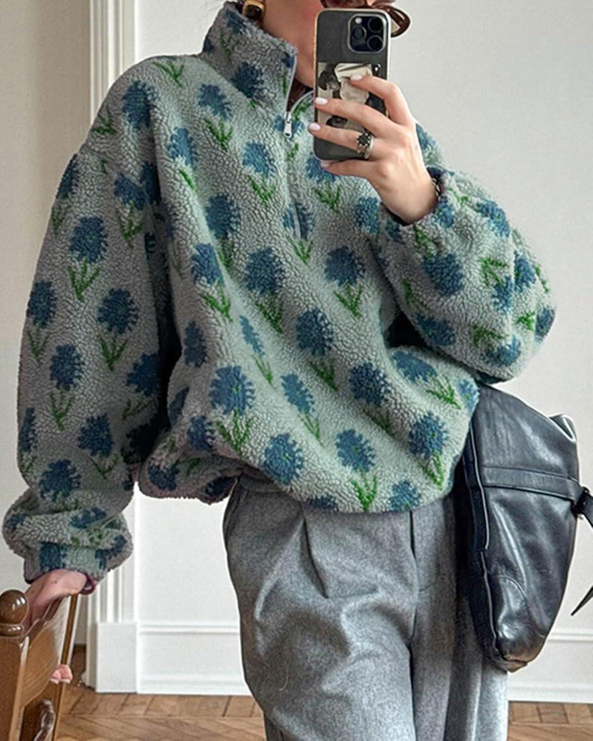 Womens Half Zip Floral Sherpa Fleece Pullover Stand Collar Oversized Sweatshirt Cute Long Sleeve Top Casual shearing oversized sweatshirt for women/ Fall winter sherpa jacket women/ Sporty quarter zip pullover women Zip up sweatshirt women warm jackets for women fuzzy warm sweaters womens chic floral fleece pullover women fall half zip blue sweatshirt sherpa jacket oversized fuzzy zip up sweaters for women fashion clothes boyfriend hoodies winter outerwear short sherpa top cute cozy sherpa pullover sweatshirt for women loose fit