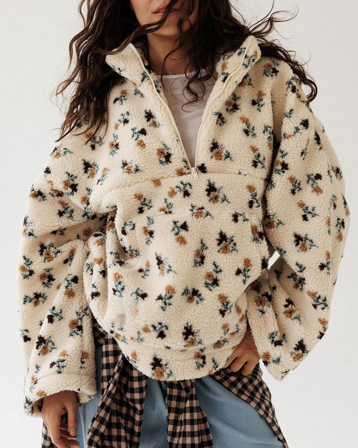 CHARTOU Womens Half Zip Sherpa Pullover Striped Oversized Sweatshirt Floral Stand Collar Fleece Jacket(Brown Floral)