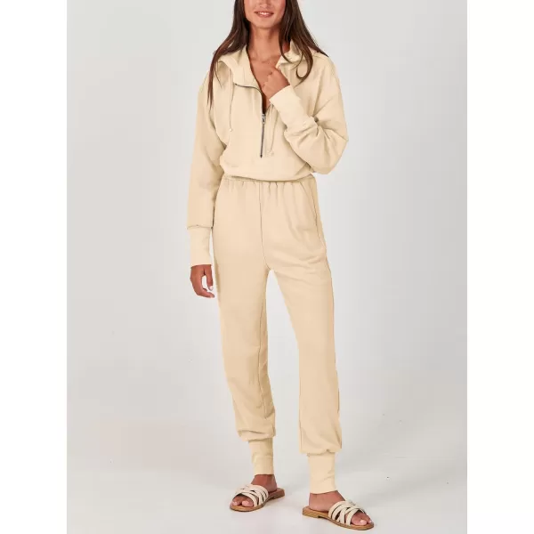 CHARTOU Women’s Jumpsuit Half Zip Hooded One Piece Outfit Elastic Waist Long Jogger Pants Jumpsuits Rompers with Pockets(Beige)