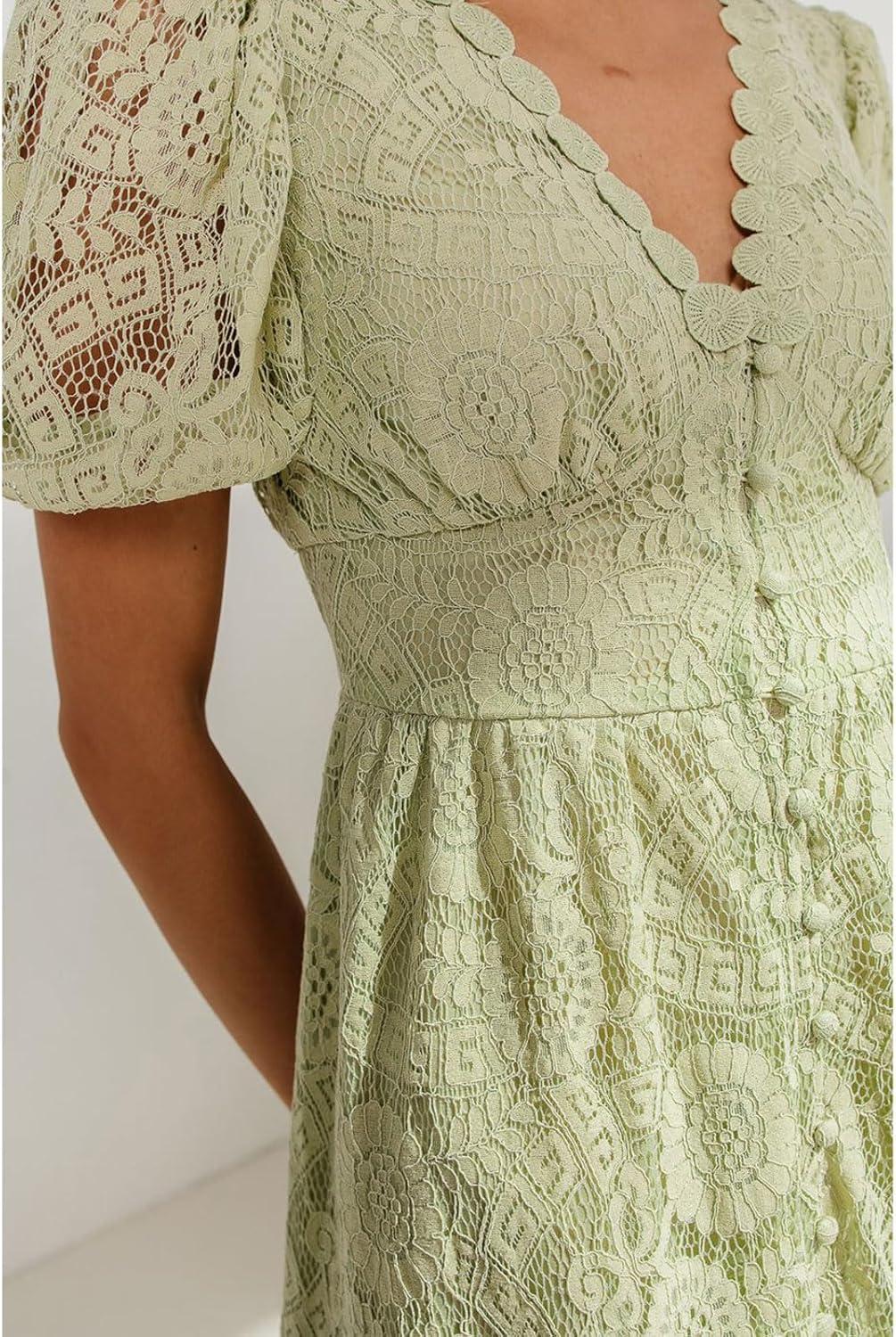 CHARTOU Women’s Lace Floral Midi Dress Button Down Puff Sleeve Flowy Pleat Tiered Elegant Lined Dress(Green)