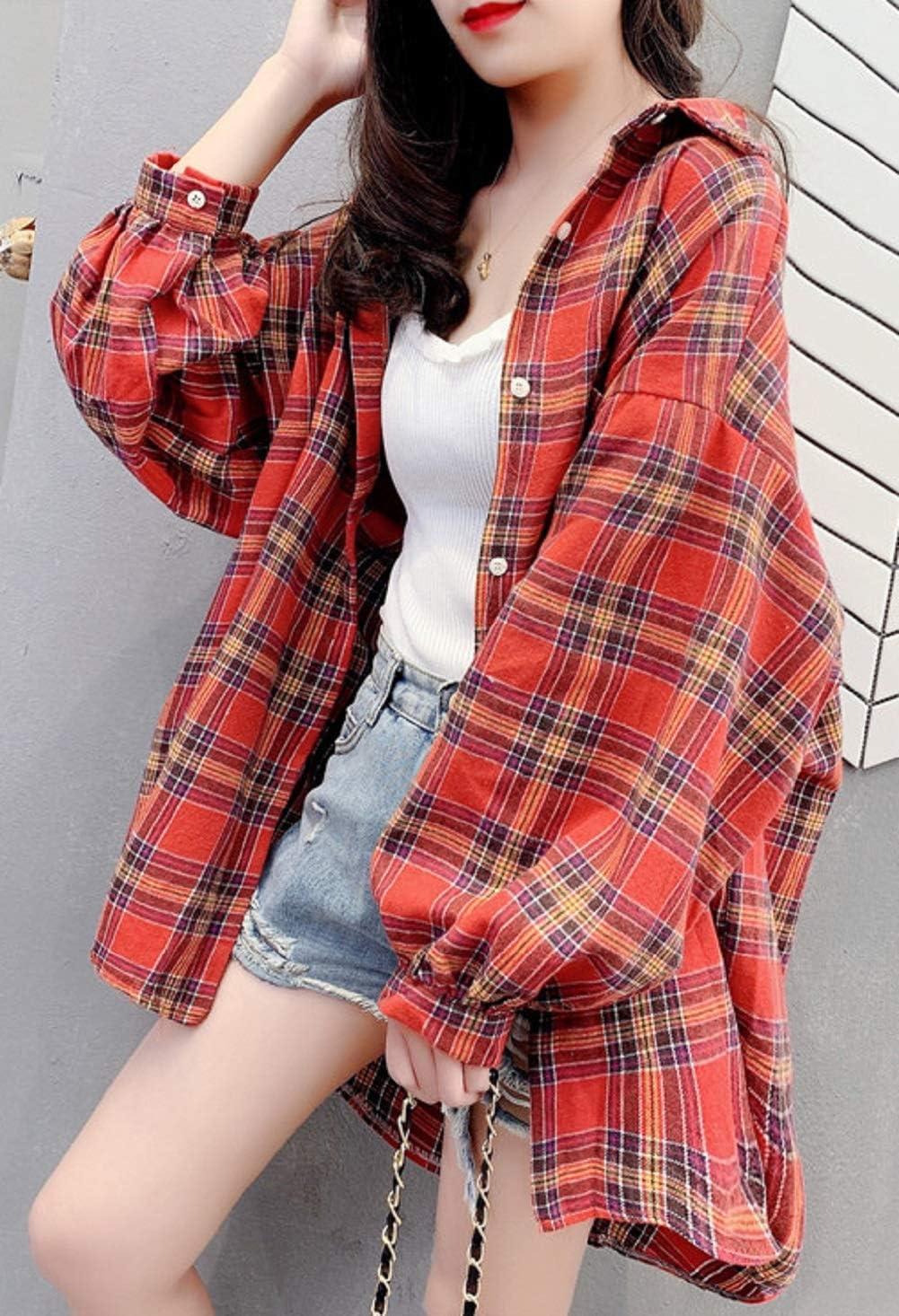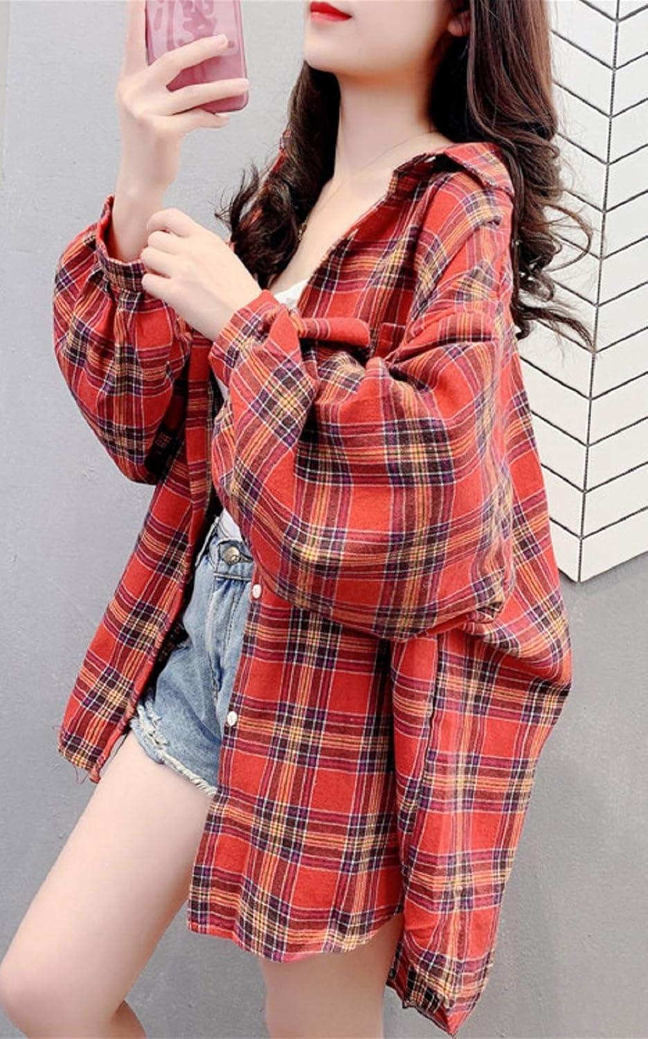 CHARTOU Women’s Lightweight Loose Fit Lapel Collar Lantern Long Sleeve Plaid Shirt Tops(Red)