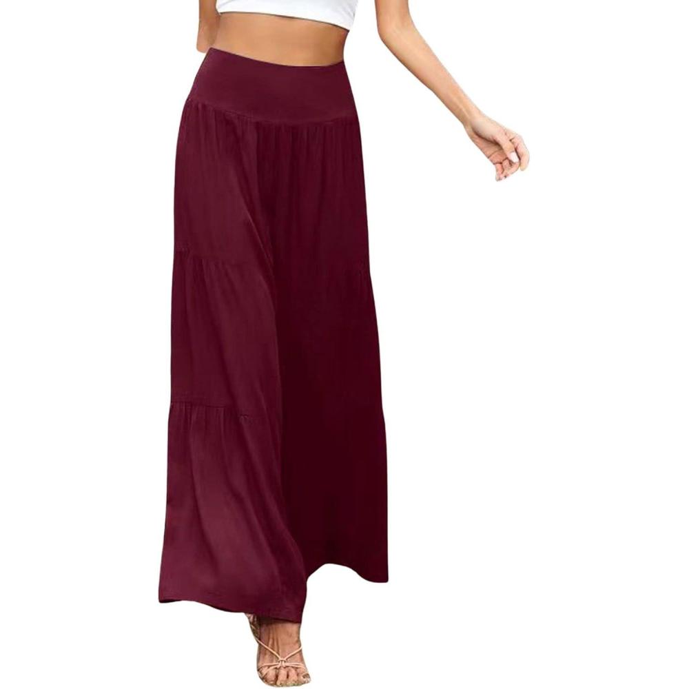 CHARTOU Women’s Linen Wide Leg Pants High Waisted Tiered Palazzo Beach Flowy Pants(Wine Red)