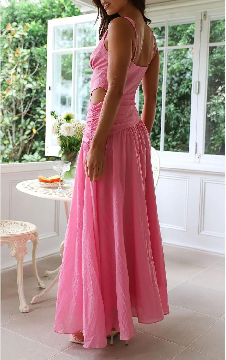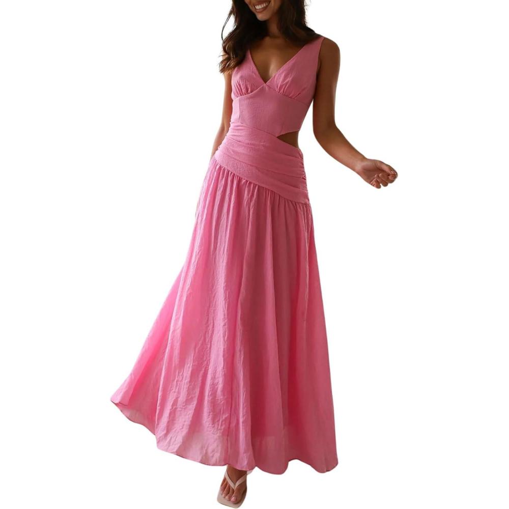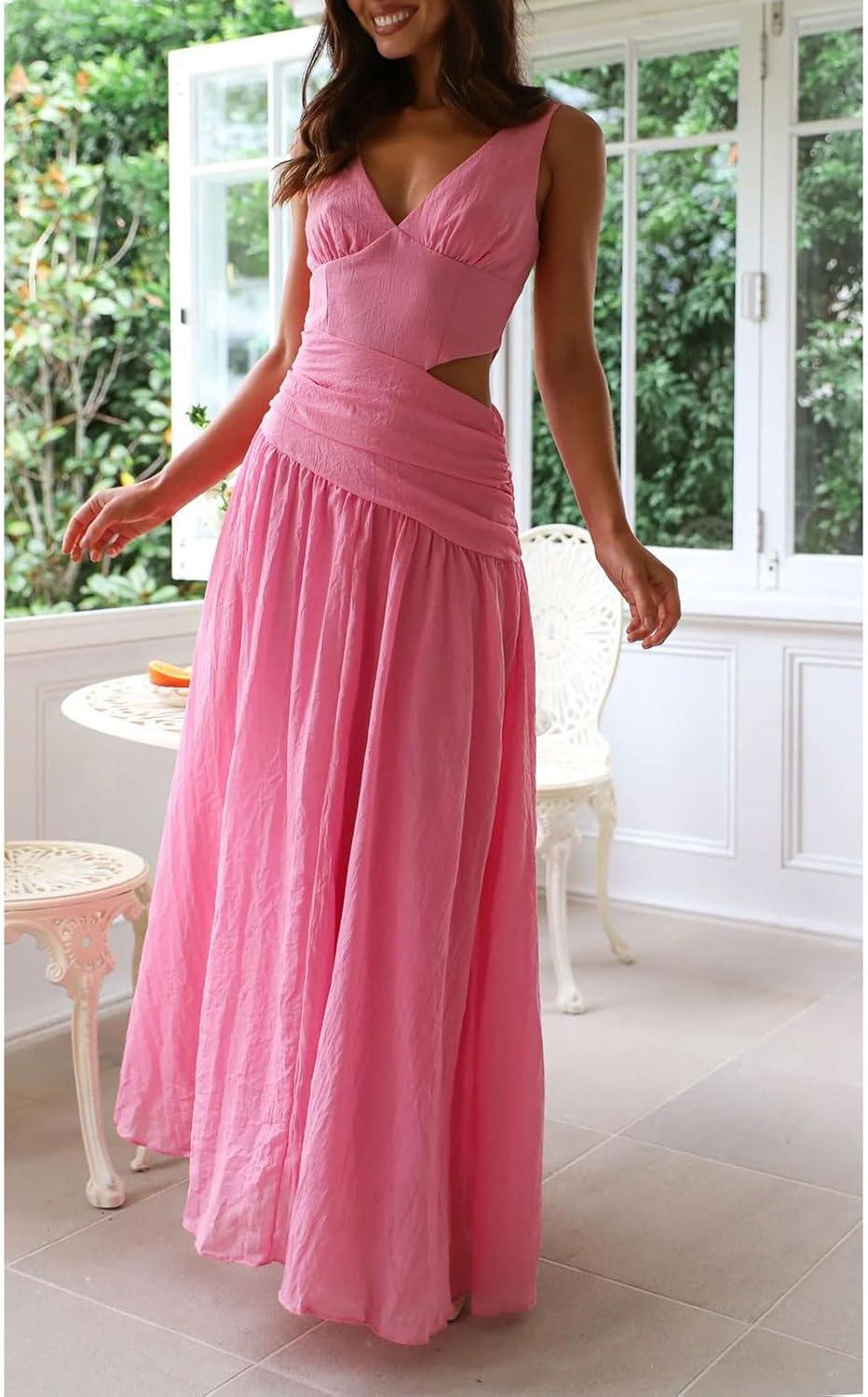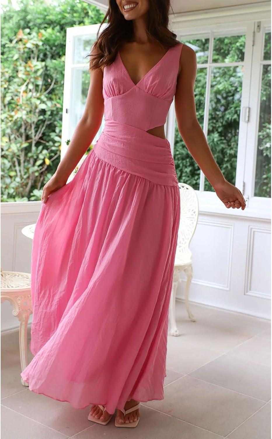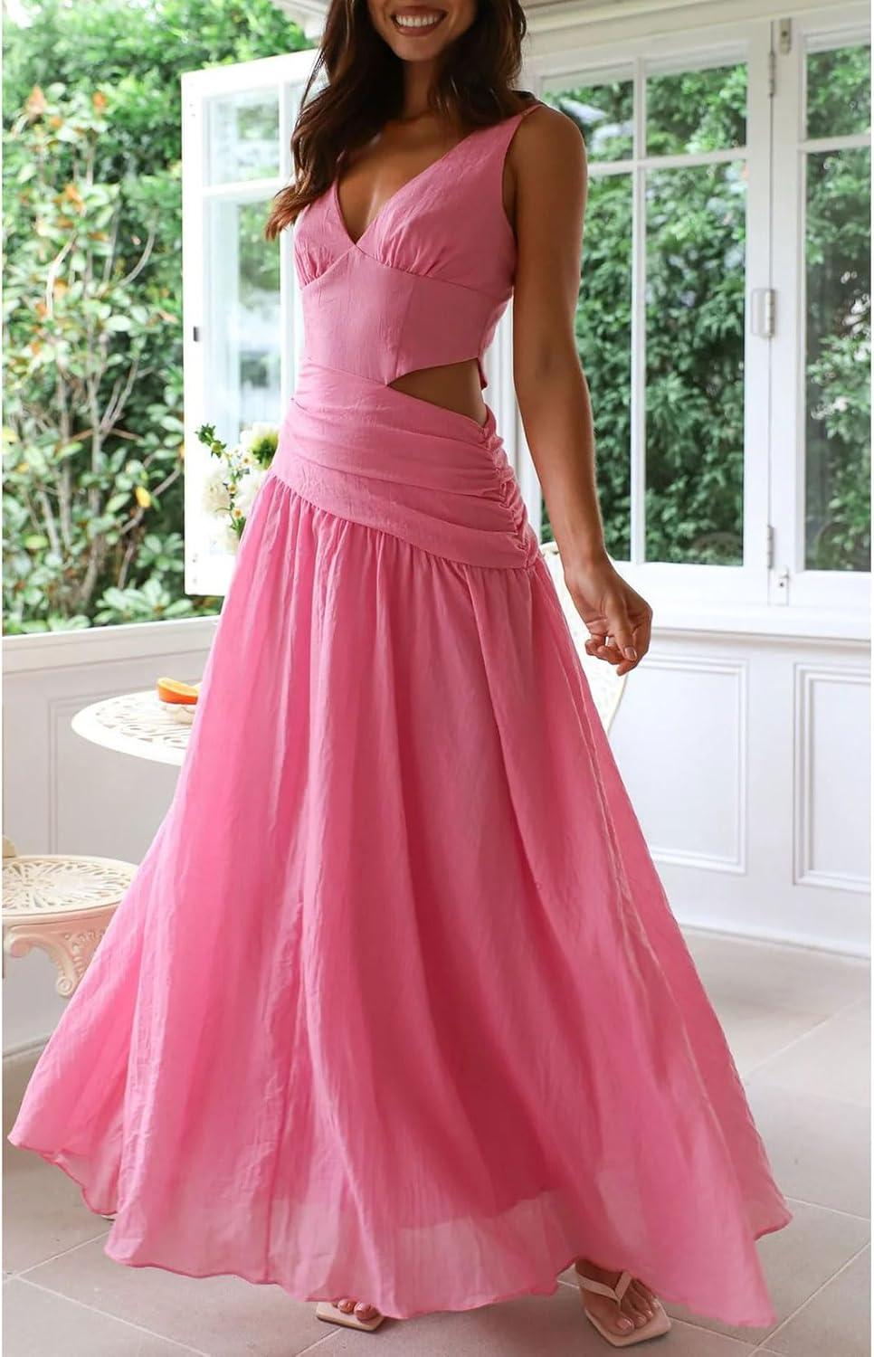 CHARTOU Women’s Long Drop Waist Ruched Summer Party Dress Flowy V Neck Cut Out Pleated Ladies Dresses(Pink)