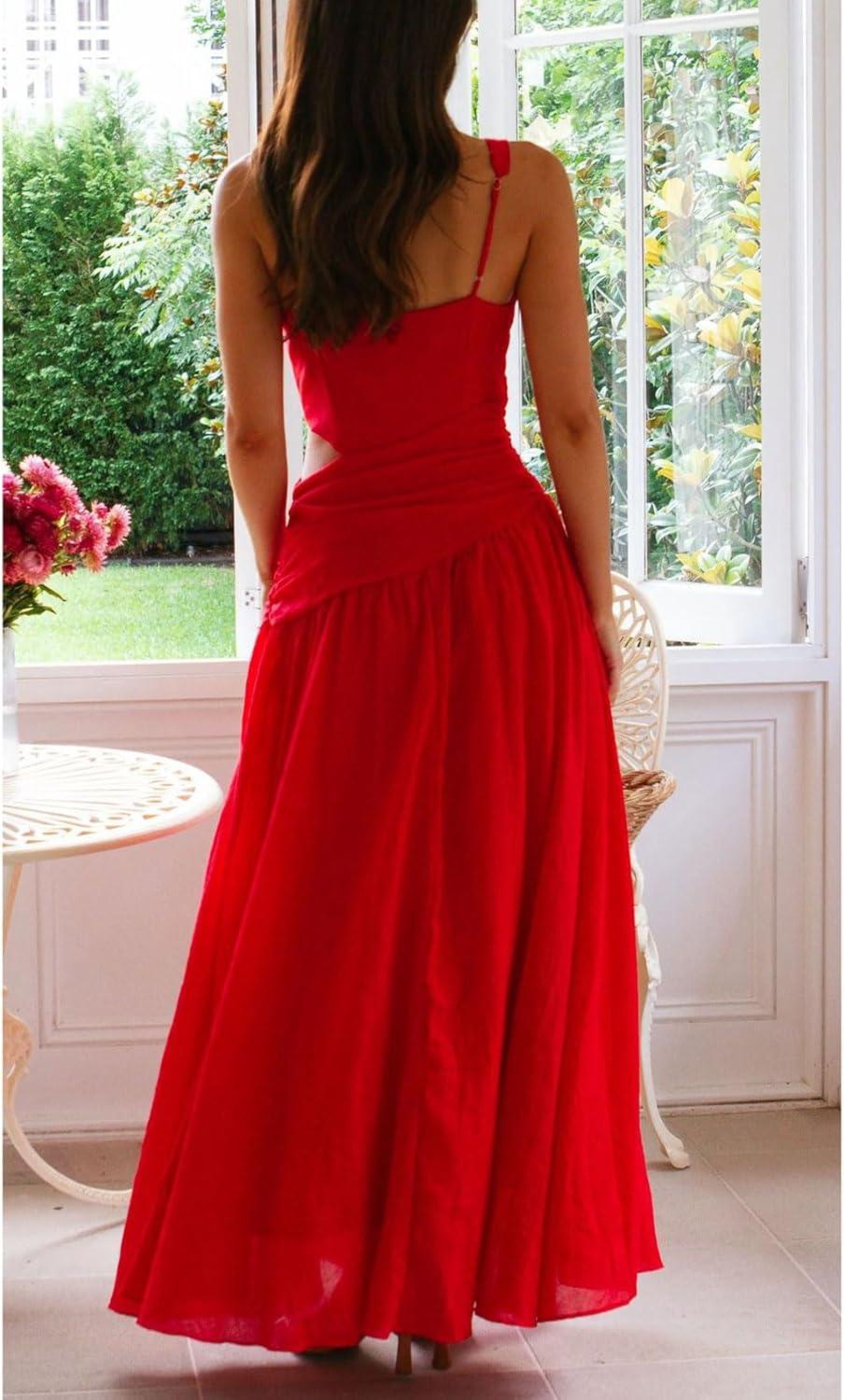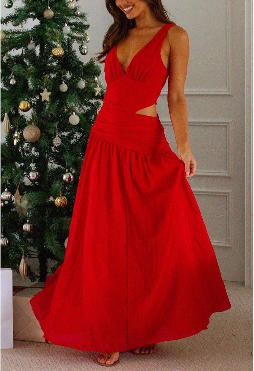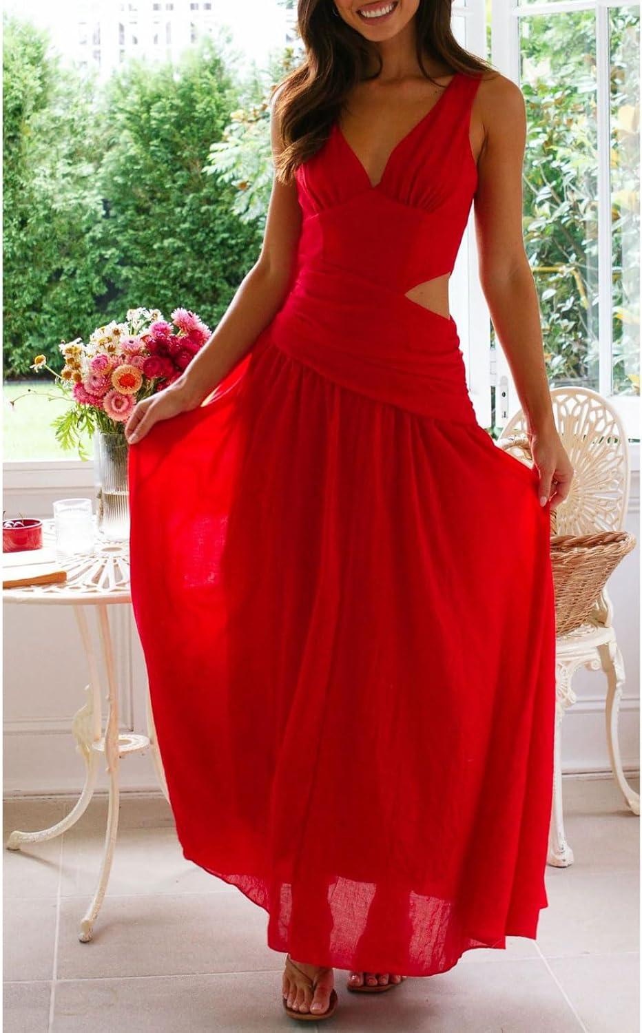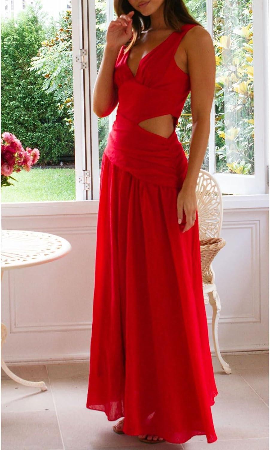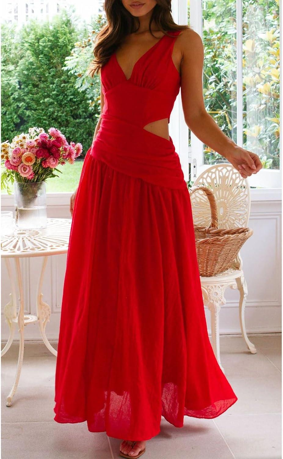 CHARTOU Women’s Long Drop Waist Ruched Summer Party Dress Flowy V Neck Cut Out Pleated Ladies Dresses(Red)