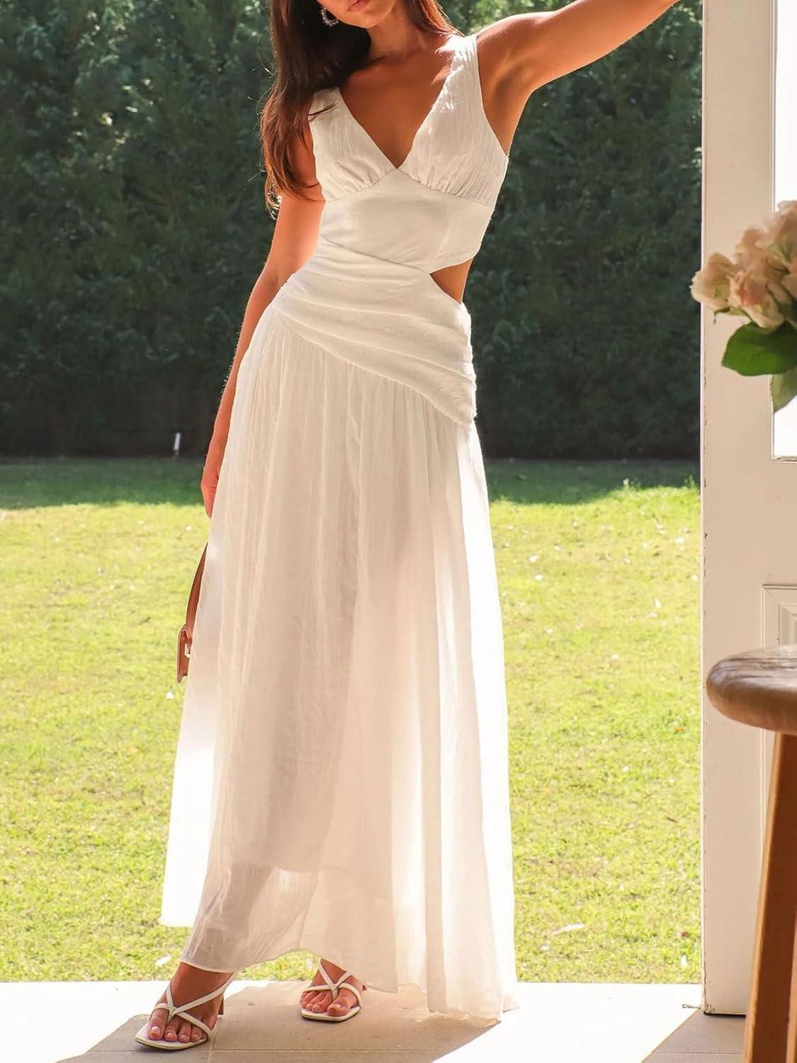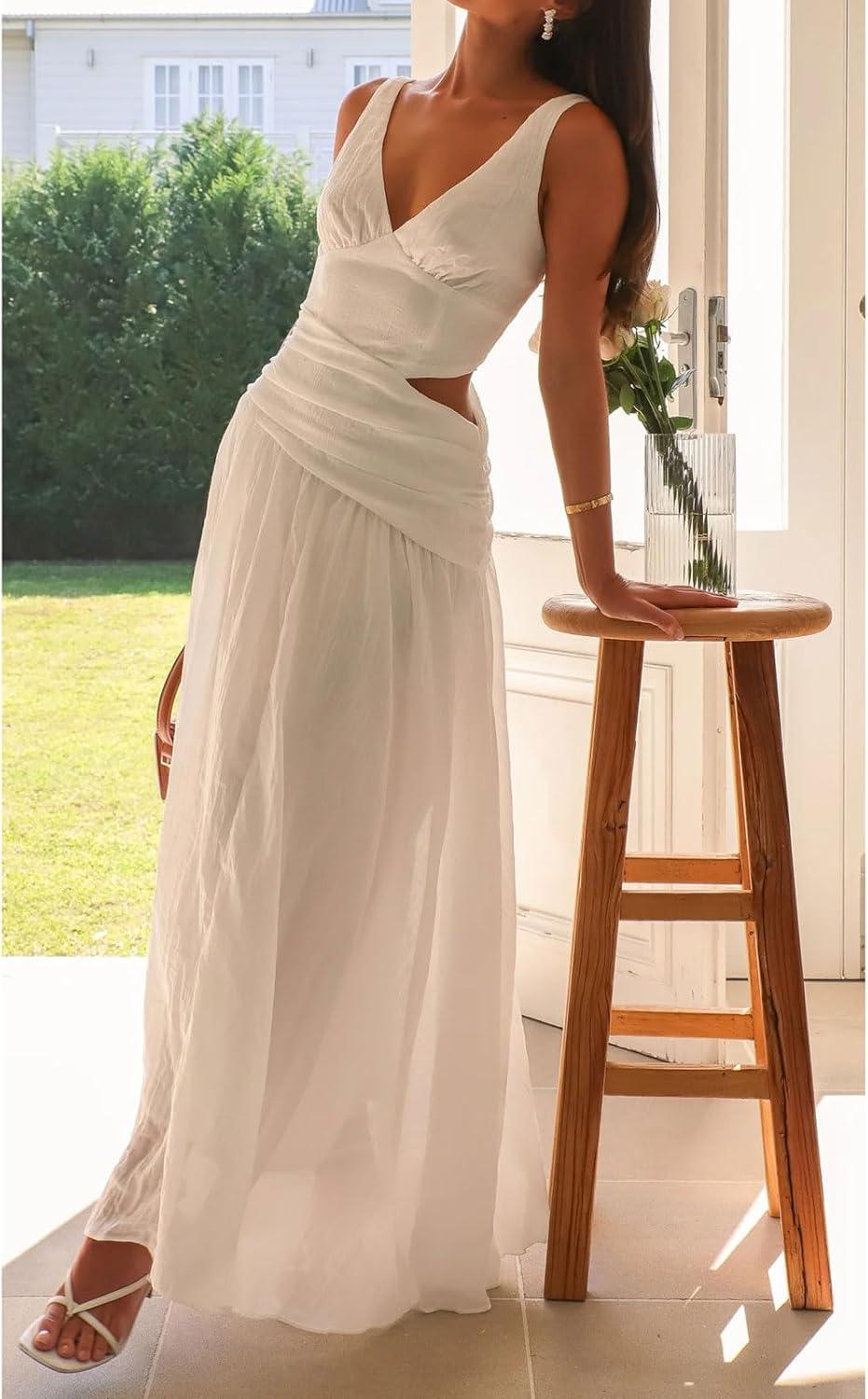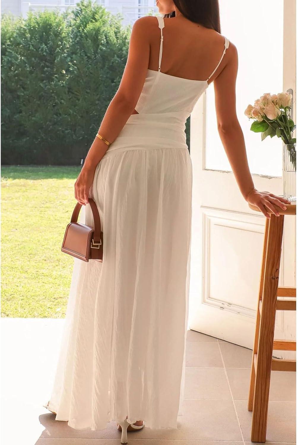 CHARTOU Women's Long Drop Waist Ruched Summer Party Dress Flowy V Neck Cut Out Pleated Ladies Dresses Size Guide: XS=US 0-2, S=US 4-6, M=US 8-10, L=US 12-14, XL=US 16-18; Please refer to our body size chart in the last picture before purchasing, can also contact us for the details of the elegant pleated dress for women Women's dressy cocktail dresses with swing hem/ Sleeveless cruise dresses for women summer/ Deep v neck sexy dress for women party/ Lightweight elegant ladies dress Features: Pull on closure, sleeveless, sexy deep v neckline and open back version, corset dropped waisted and side hollow out,ruched and pleated, flowy long dress with big swing hem, slim fit, lightweight, elegant cocktail dresses for women, solid color- white wedding guest dresses for women, red dresses, pink dress Flowy Maxi Dress Woman: Summer trendy cocktail long dress/ Flowy pleated dress for women vacation outfits/ White beach party dress/ Sleeveless maxi dress/ Elegant birthday red dresses for women outings/ Drop waisted wedding guest dresses for women/ Pink prom dress with swing hem/ Dressy lady dresses/ Formal ruched dress/ Pleated sexy dresses for women cruise Occasion: Suit for cocktail party, wedding guest, cruise wear, birthdays, club, beach vacation, date, evening, vacation, casual daily wear, prom, etc. You can match with high heeled sandals, necklace, earrings for charming look; can also pair with slippers for comfy wear Women's drop waist cocktail dresses flowy long white wedding guest dresses for women elegant birthday red dresses for women formal prom dress party ruched summer maxi beach pink dress with big swing hem