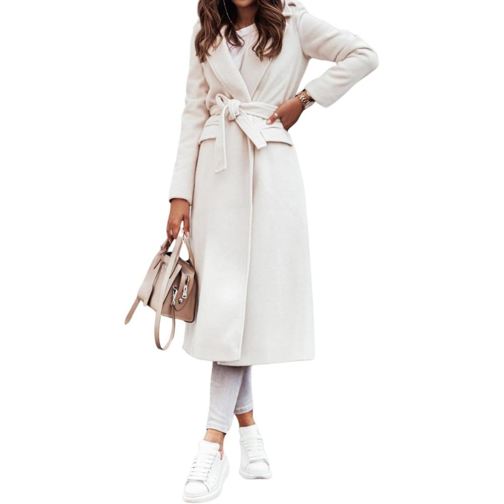 CHARTOU Womens Long Wool Blend Jackets Tie Belt Lapel WrapTrench Coat Fall Casual Woolen Pea Coats Overcoat with Pockets(White)