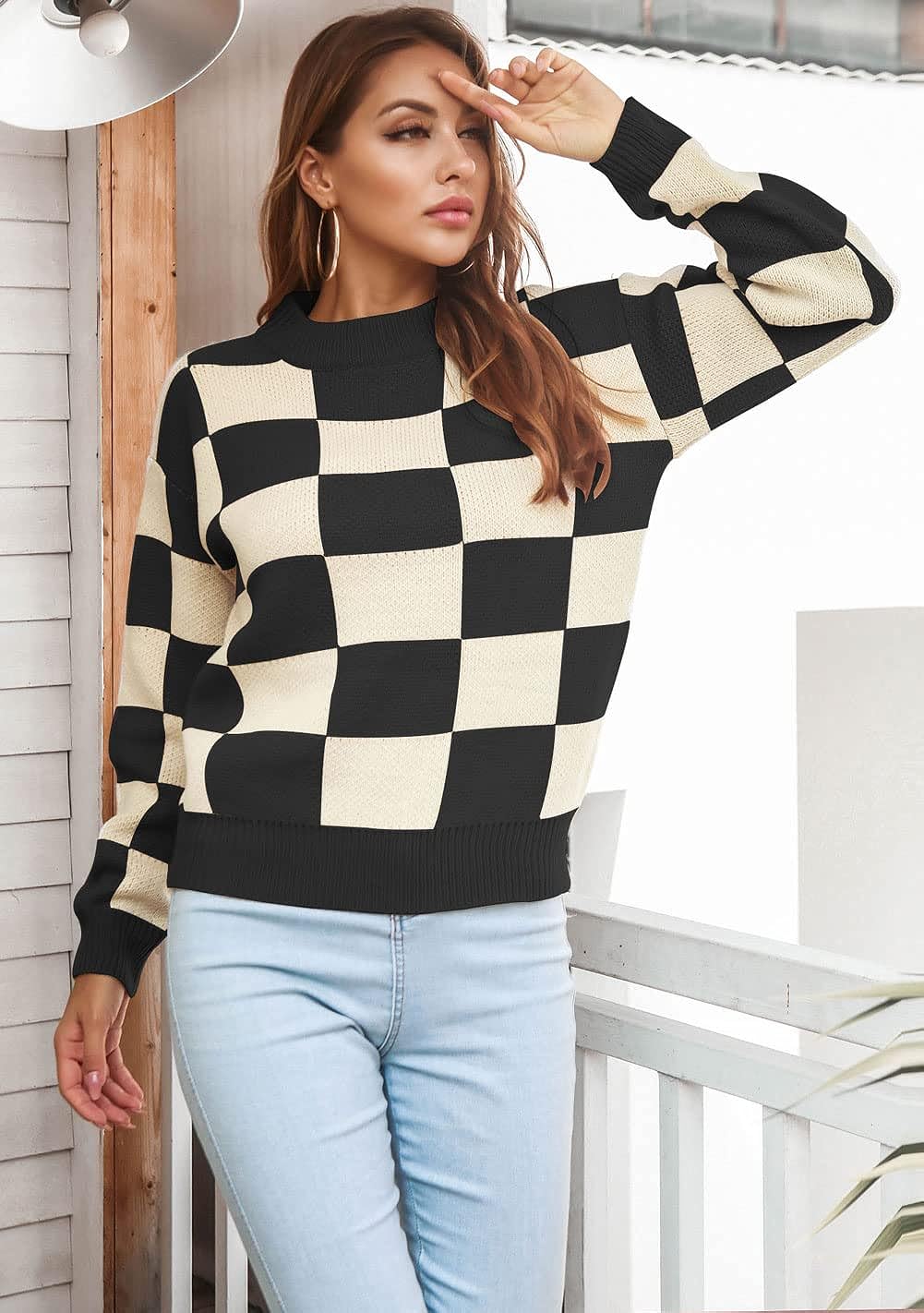 CHARTOU Women's Loose Crewneck Color Block Plaid Knit Sweater Knitwear Pullover Top