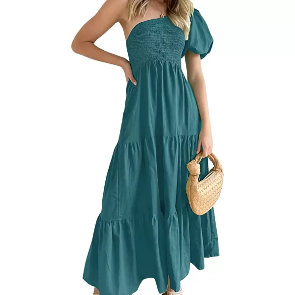 CHARTOU Women’s One Shoulder Smocked A-Line Tiered Layered Flared Ruffle Long Dress(Blue Green)