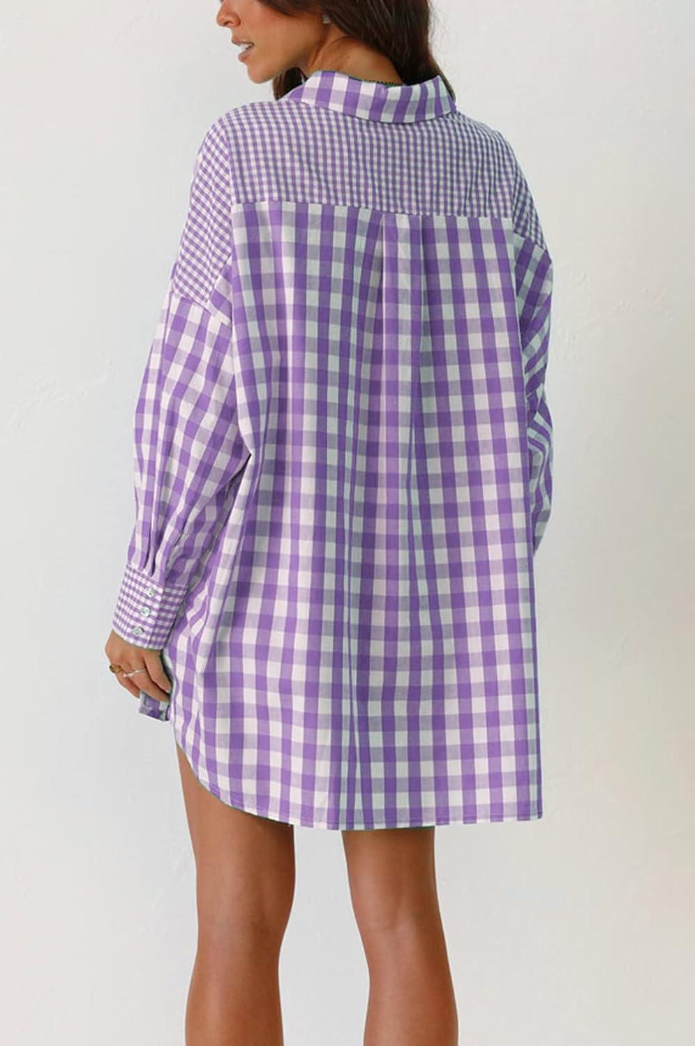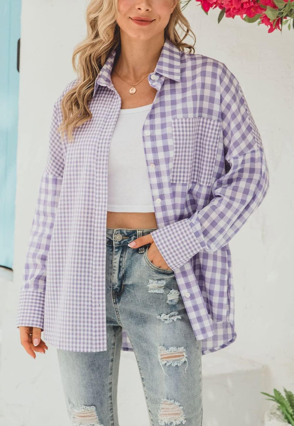 CHARTOU Women’s Oversized Button Down Shirt Boyfriend Style Contrast Plaid Blouse Tops(Purple)