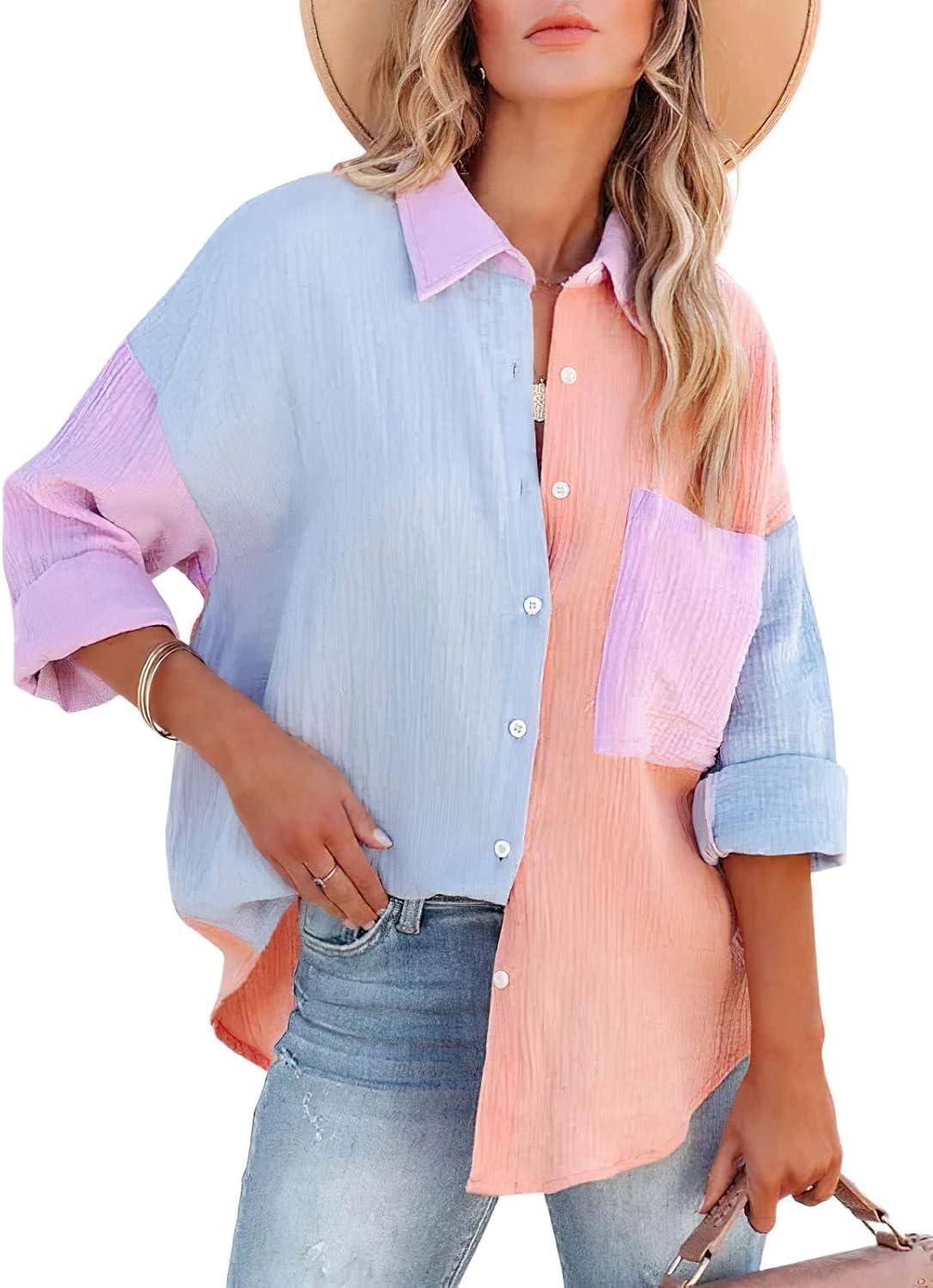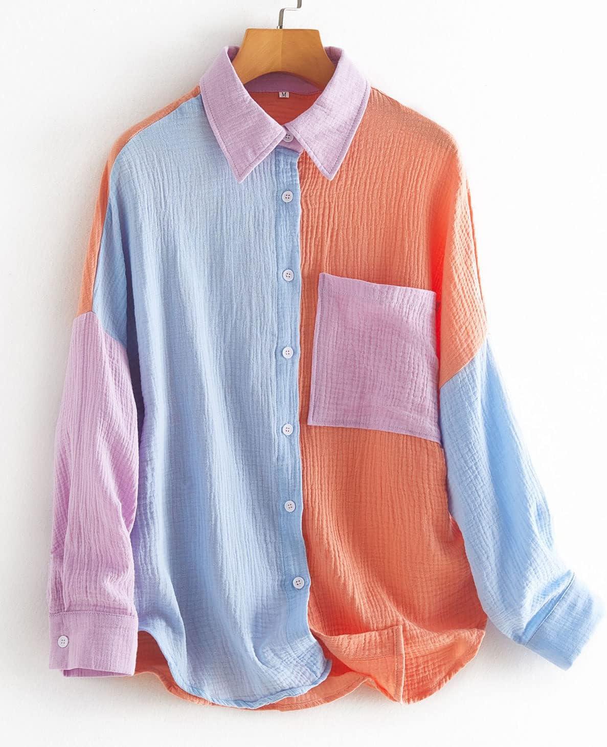 CHARTOU Women’s Oversized Color Block Button Down Shirt Drop Long Sleeve Shirt Blouse(Blue)