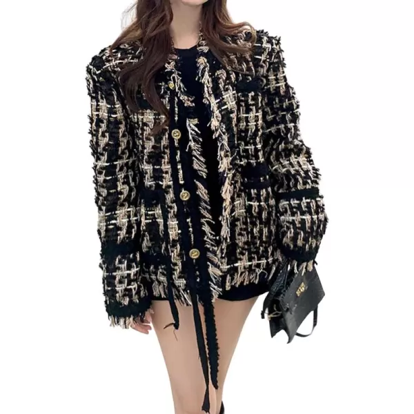 CHARTOU Women Tweed Blazer Cable Knit Casual Button Down Fringe Suit Jacket Long Sleeve Jacket Overcoat(Black)