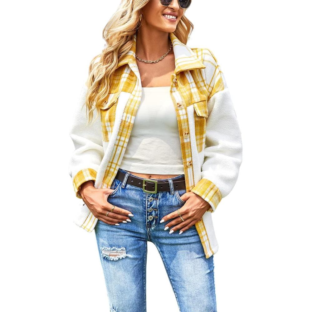 CHARTOU Women’s Oversized Fleece Shacket Flannel Brushed Patchwork Plaid Button Down Shirt Jacket Coat(Yellow)