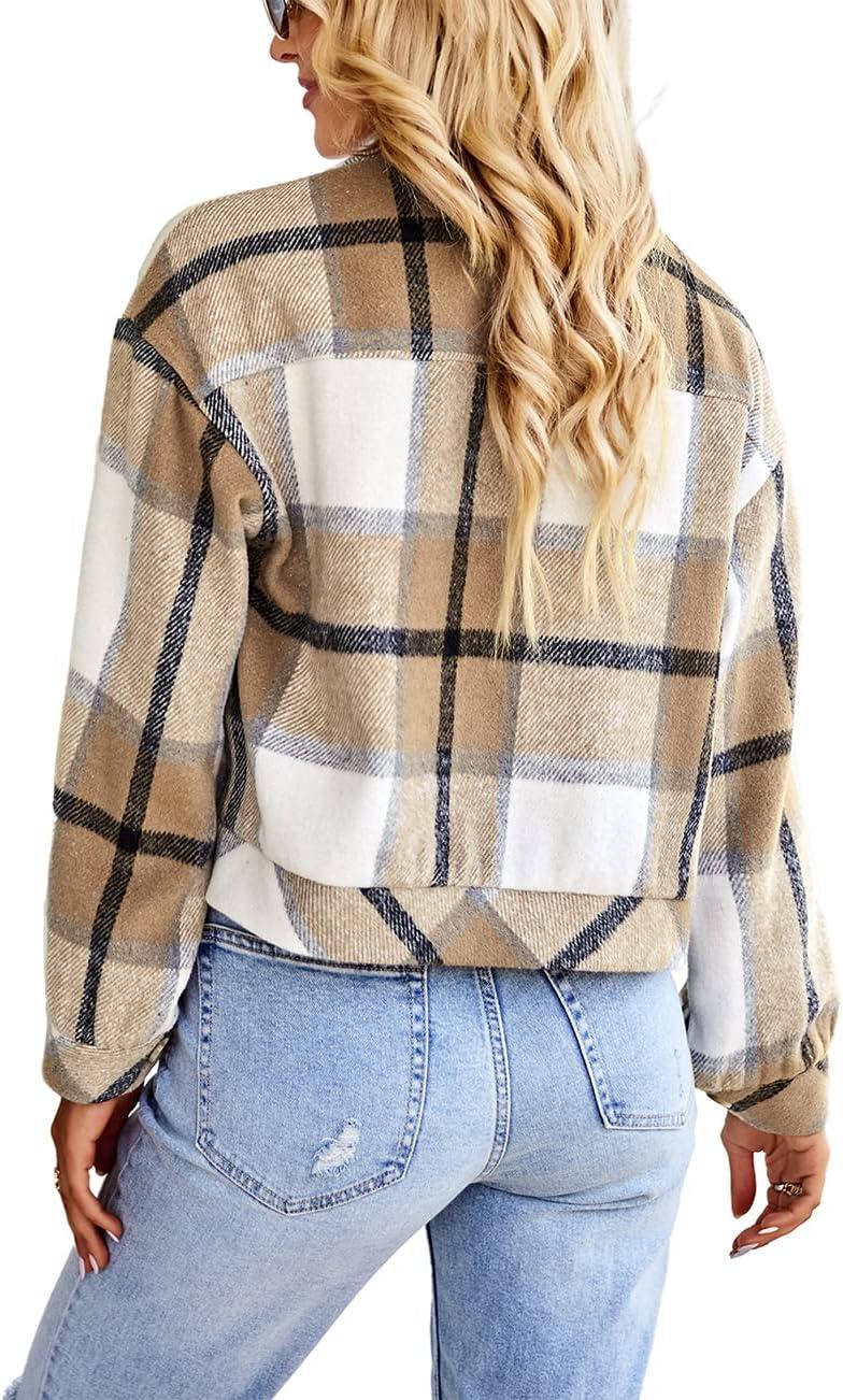 CHARTOU Women’s Oversized Plaid Shacket Flannel Brushed Checkered Button Down Crop Top Shirt Jacket(Khaki)