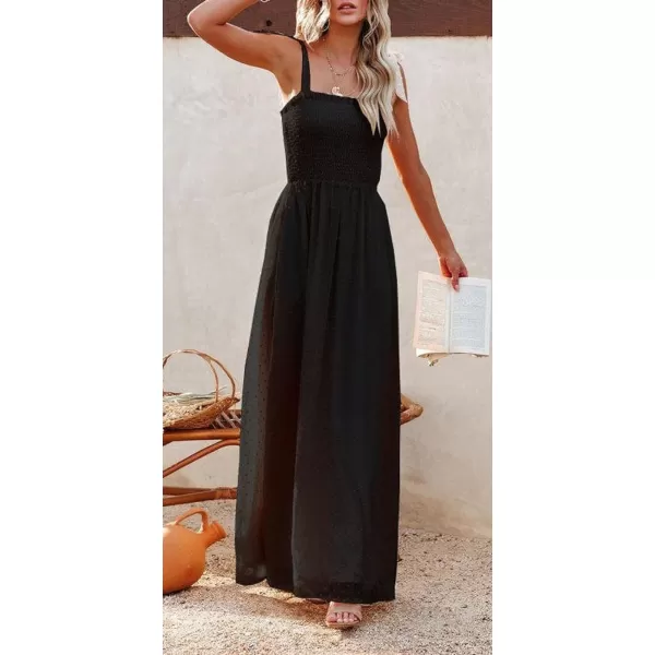 CHARTOU Women’s Self-Tie Swiss Dot Smocked High Split Chiffon Holiday Maxi Long Dress(Black)