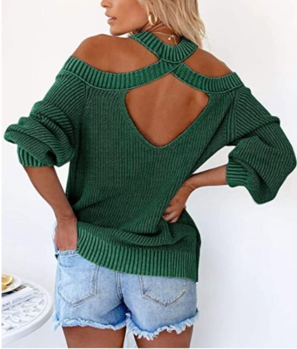 CHARTOU Women’s Sexy Halter Neck Cold Shoulder Backless Loose Fit Pullover Sweater Tops(Green)