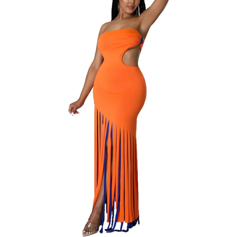 CHARTOU Women’s Sexy Off Shoulder Hollow Out Irregular Tassel Bandeau Maxi Long Dress(Orange)