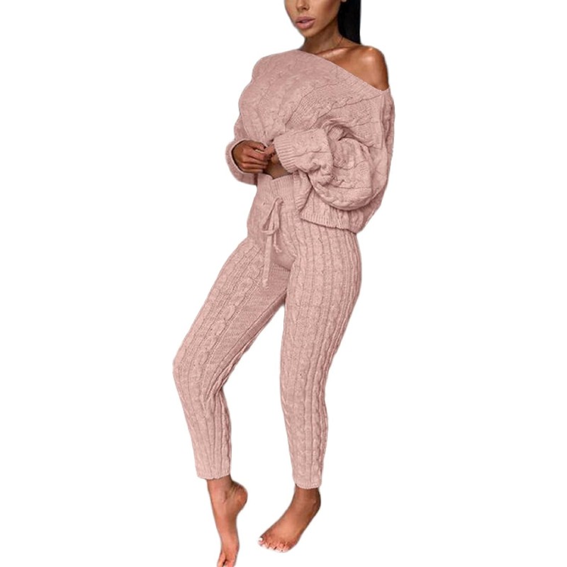 CHARTOU Women’s Sexy One Shoulder 2 Pieces Outfit Chunky Cable Knit Sweater Crop Top Pants Set(Pink)