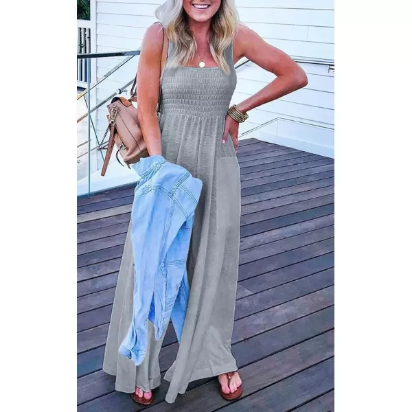 CHARTOU Women’s Sexy Sleeveless Smocked Wide Leg Jumpsuit Stretch One Piece Outfit Palazzo Pocket(Grey)