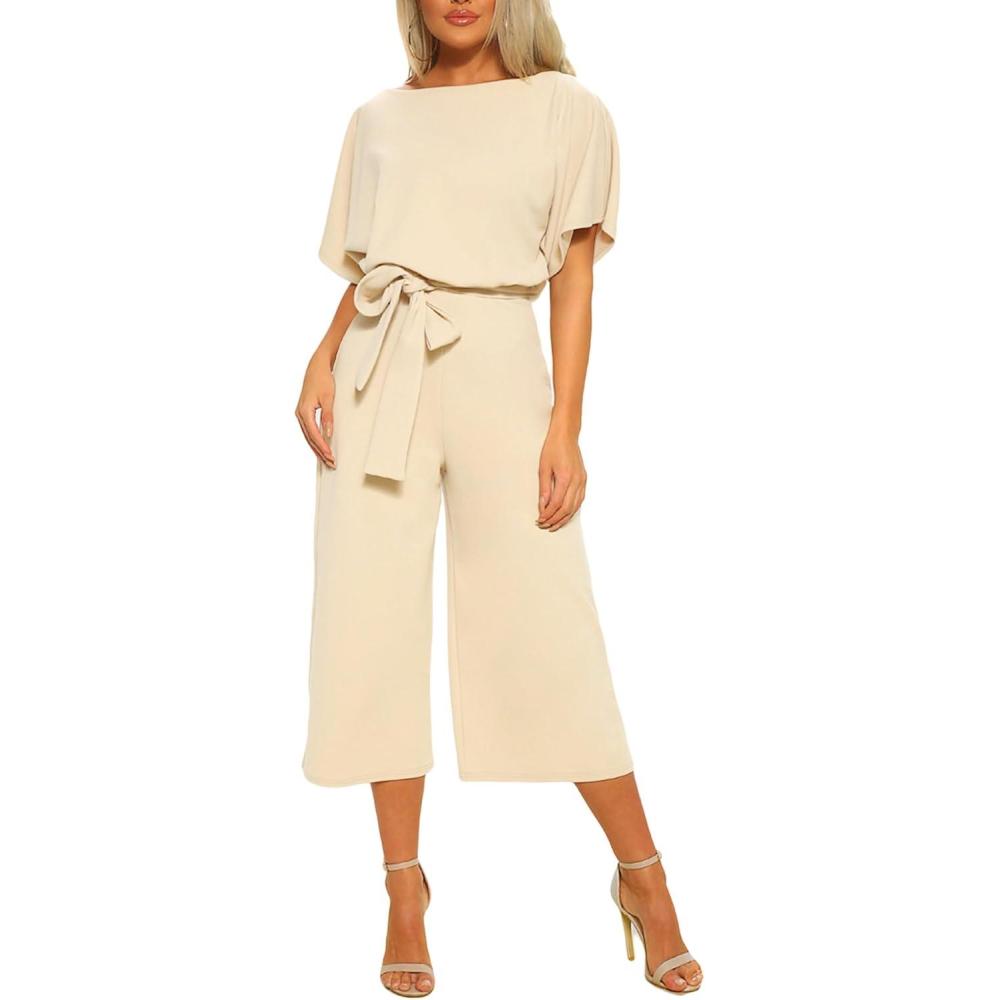 CHARTOU Women’s Short Sleeve Bow Tie Wide Leg Cropped Capri Romper Palazzo Pants Jumpsuit(Beige)