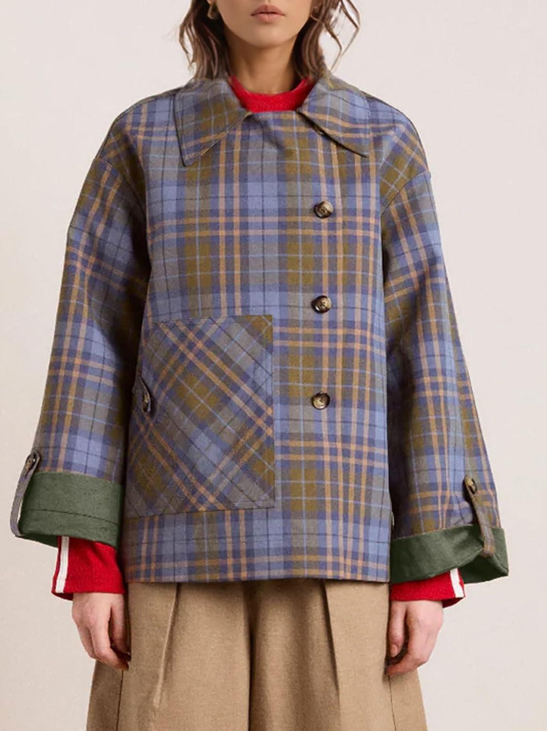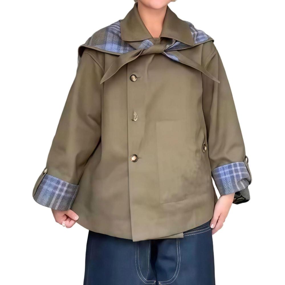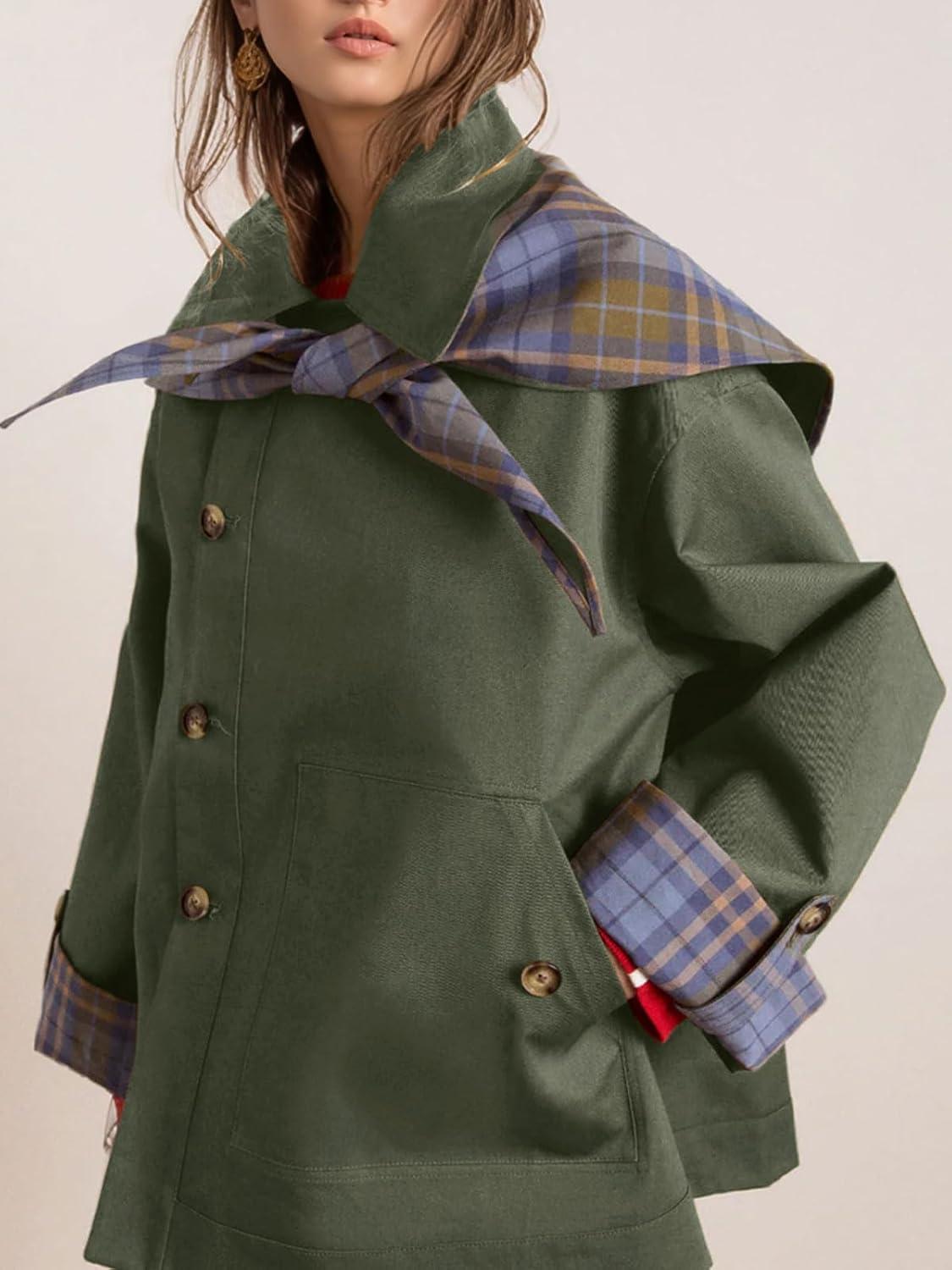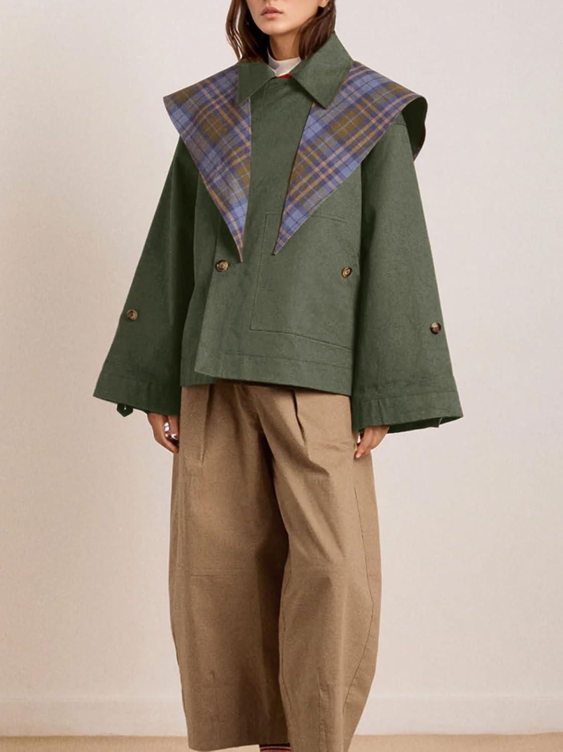 Women's Short Trench Coats Fall Notch Collar Plaid Reversible Oversized Jacket with Pockets Single breast cropped trench jacket for women/ Vintage gingham trench coat women casual outwear/ Novelty lapel trench coat with shawl Classic cropped jacket women loose fit/ Notched lapels trench coat women/ Front button closure/ Cute belled sleeve bomber jacket/ Button-tab cuffs/ 1 triangle scarf/ Gingham lightweight jacket women/ Long sleeve bomber jacket women/ Relaxed oversized fit/ 4 front patch pockets/ Retro olive green trench coat Retro Short Trench Coat Spring fall reversible trench coats women Stylish trench coat women Fall winter reversible trench coat women notched lapel crop coat oversized light jacket for women fashion clothes checkered coatigan for women classy cute shawl wrap short trench tops western teen girls vintage casual plaid trench windproof outfits