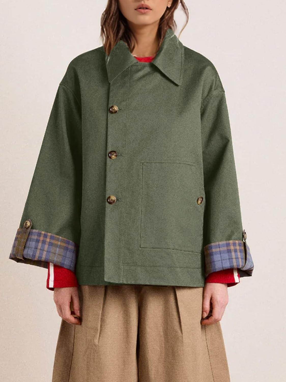 CHARTOU Women’s Short Trench Coats Fall Notch Collar Plaid Reversible Oversized Jacket with Pockets(Olive)