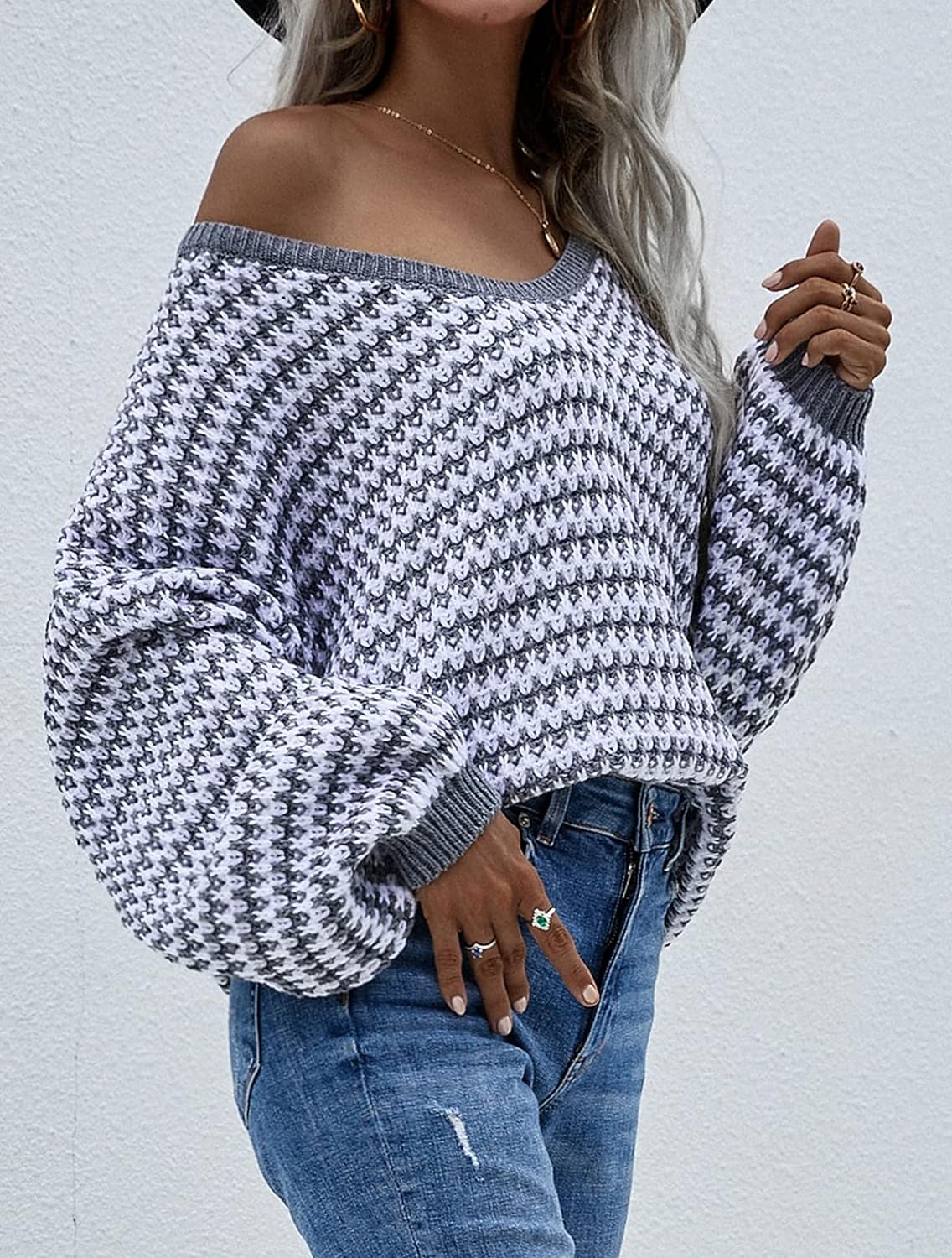 CHARTOU Women’s Slouchy Deep V Neck Stripes Lantern Sleeve Oversized Knitwear Pullover(Grey)