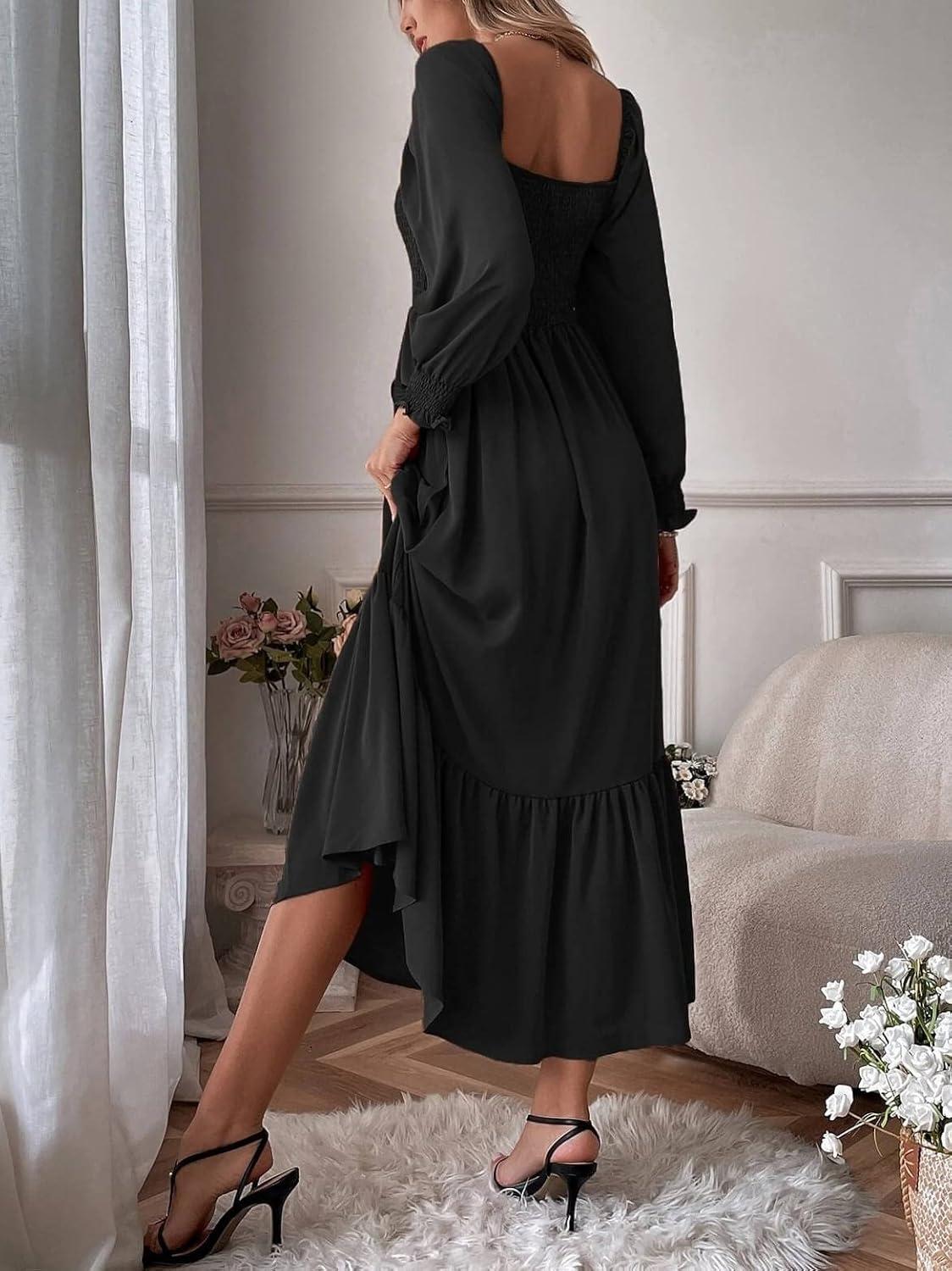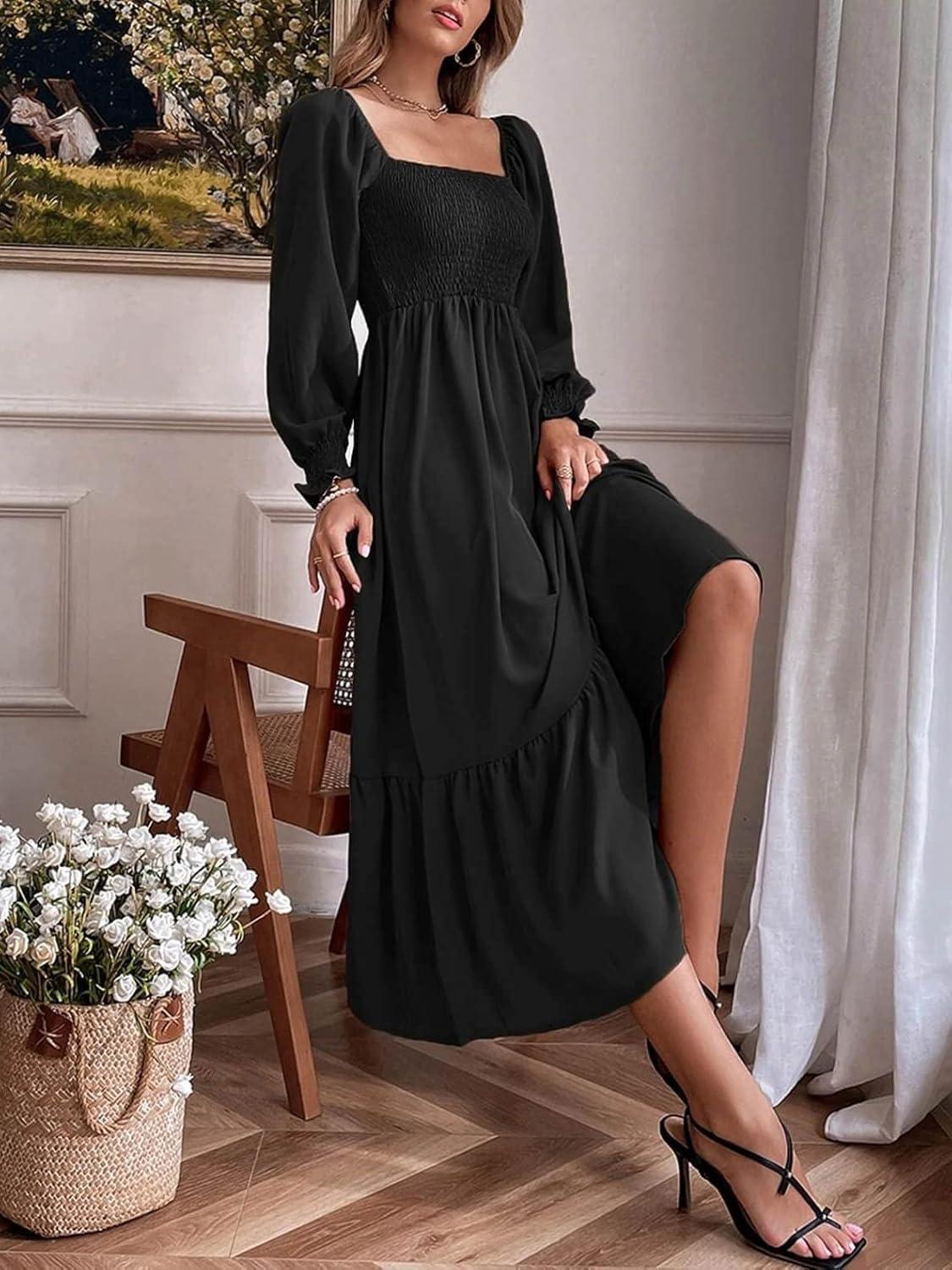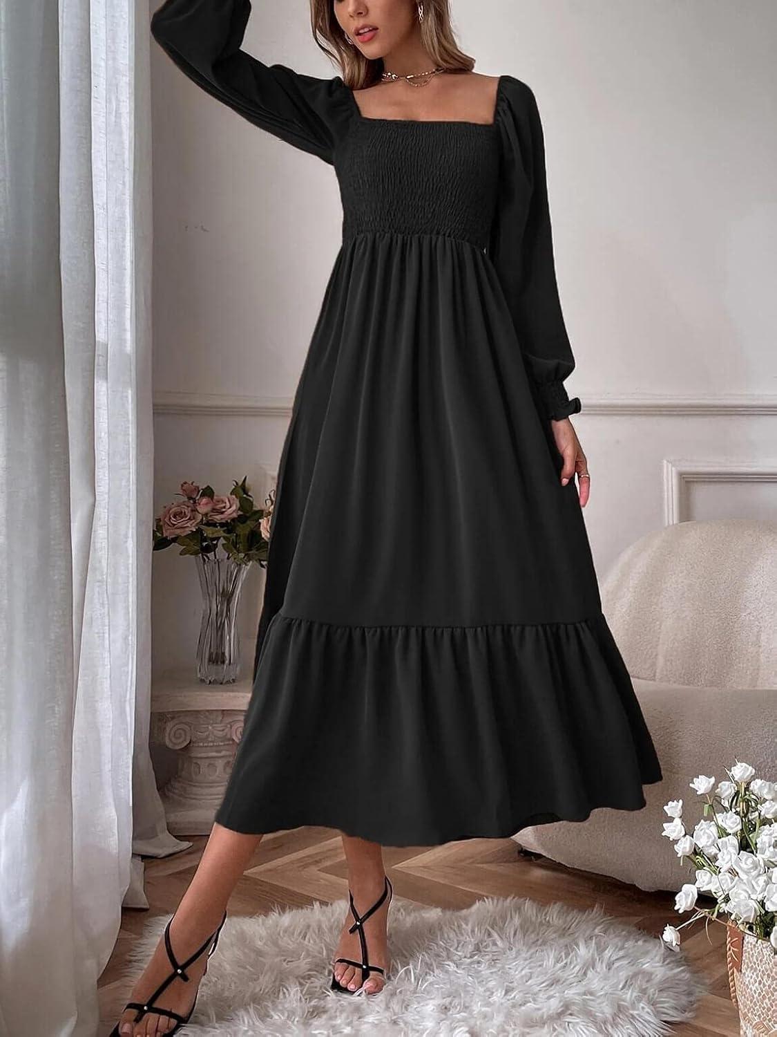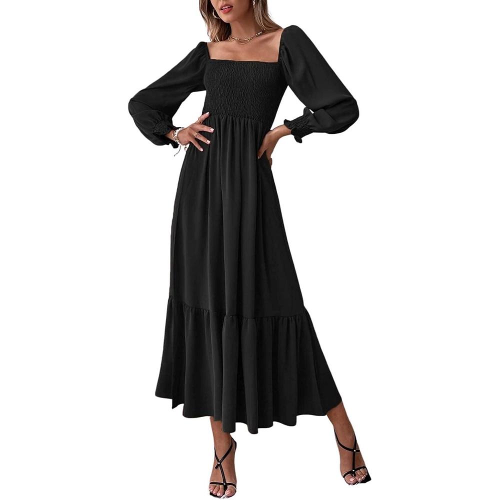 CHARTOU Women’s Square Neck Long Puff Sleeve Smocked Pleated A-Line Flared Dress(Black)
