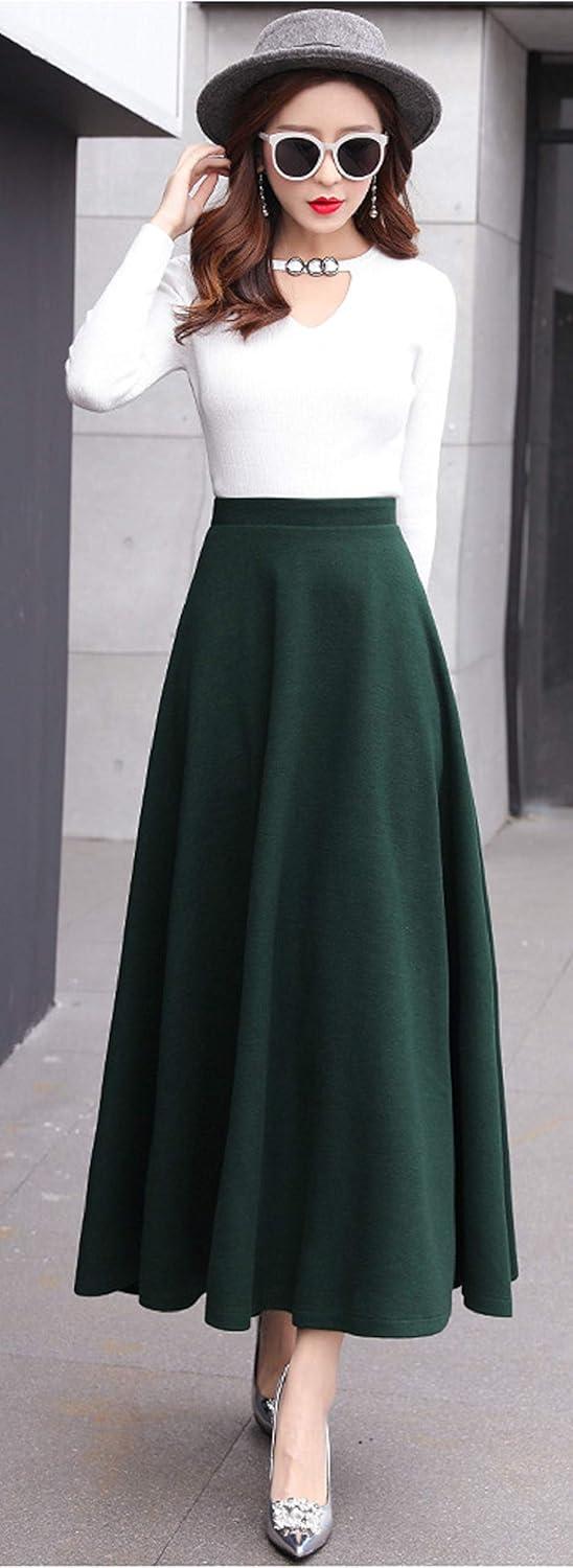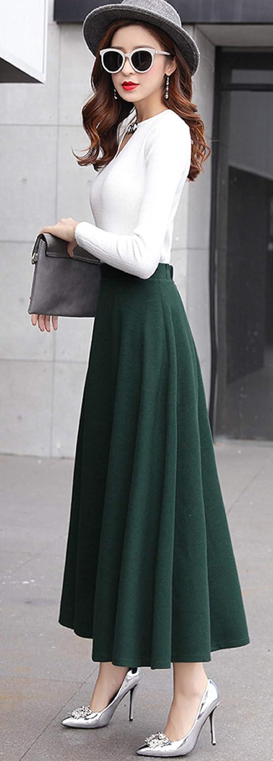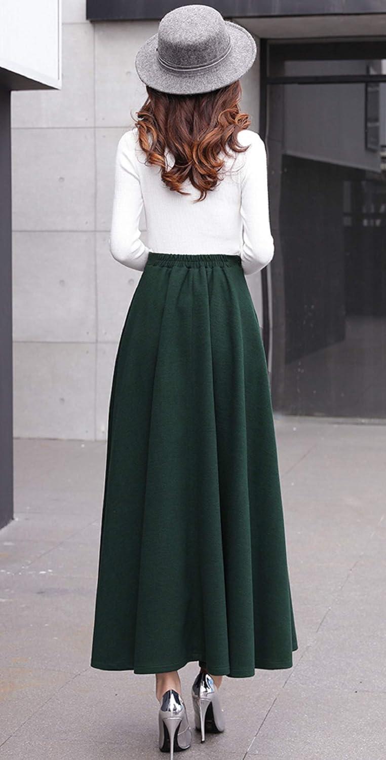 CHARTOU Women’s Stretchy High Waist Woolen Flared A Line Swing Maxi Long Skirt(Dark Green)