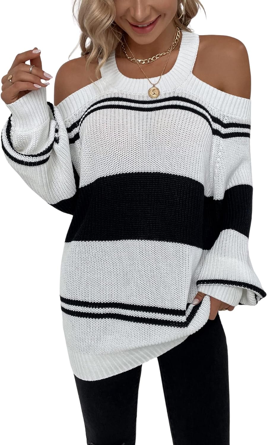 Get the CHARTOU Women’s Striped Color Block Halter Neck Cold Shoulder Lantern Sleeve Pullover Sweater(White and Black) you want at a price you can afford with our markdown sale.