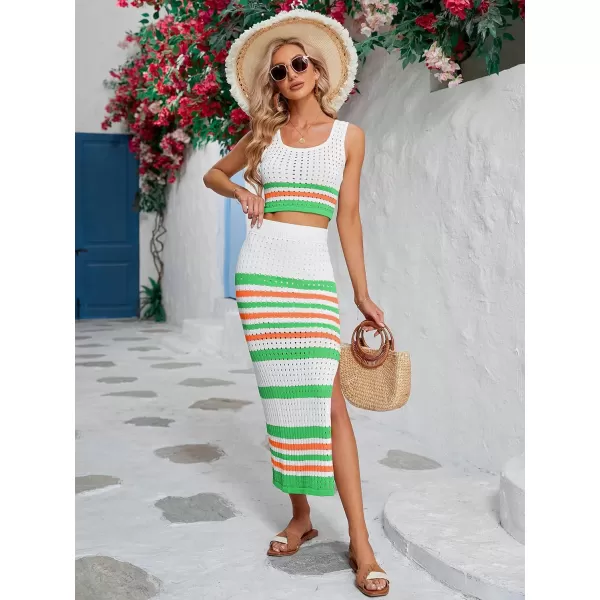 CHARTOU Women’s Summer 2 Piece Outfits knitted Hollow Out Color Block Tank Top and Bodycon Slit Skirt Set(Green)
