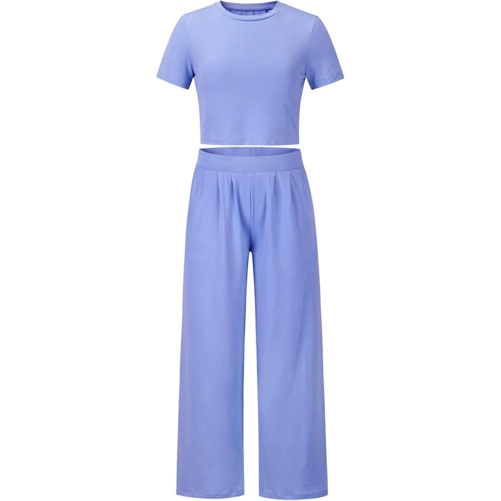 Women's Summer Casual 2 Piece Set Outfits Crop Top T Shirt Wide Leg Beach Pants Palazzo