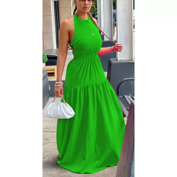 CHARTOU Women’s Summer Halter Backless Elastic Waist Solid Color Swing Maxi Long Dress(Green)