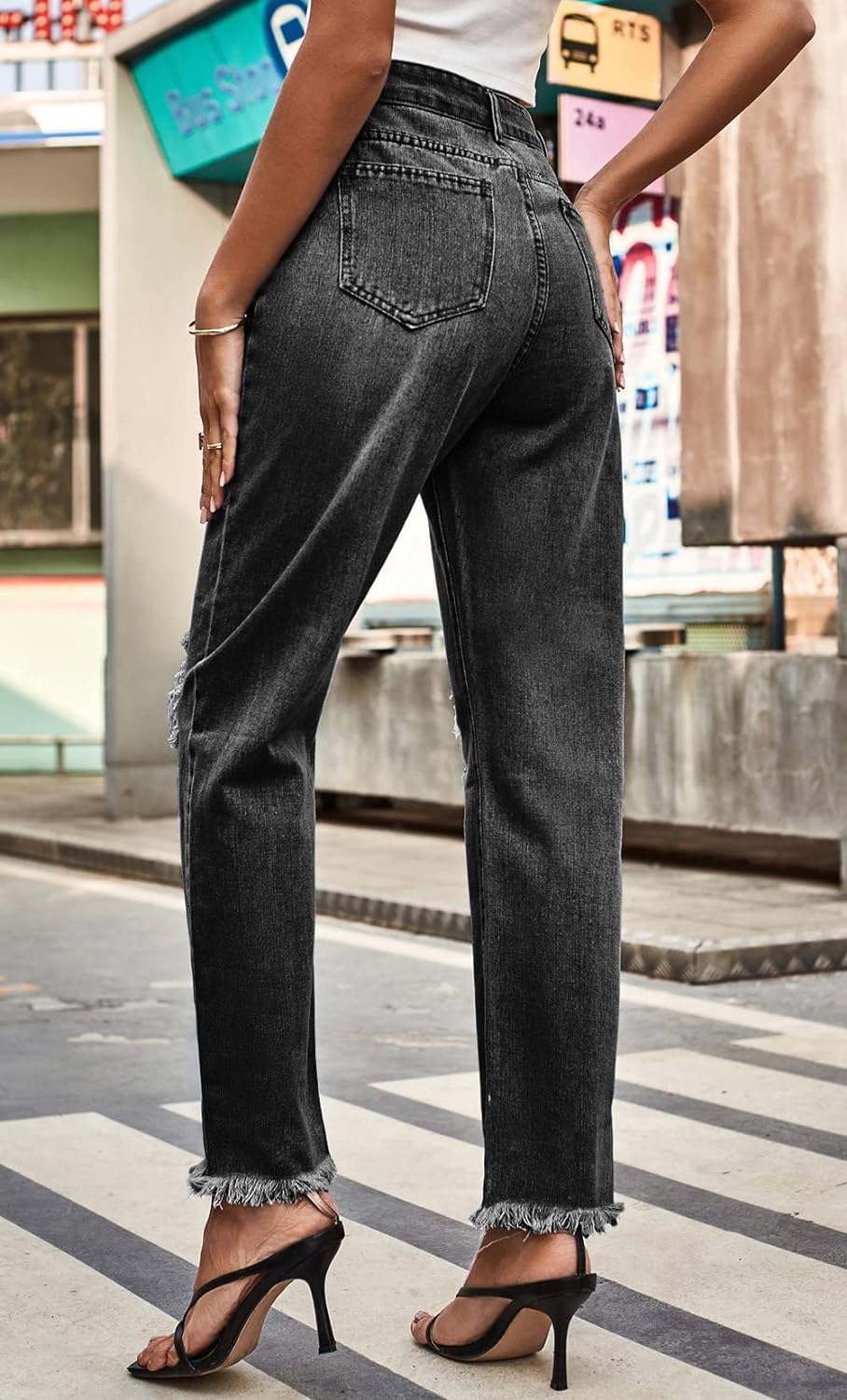 CHARTOU Women’s Summer High Waisted Jeans Straight Leg Destroyed Holes Raw Cut Cropped Denim Pants(Black)