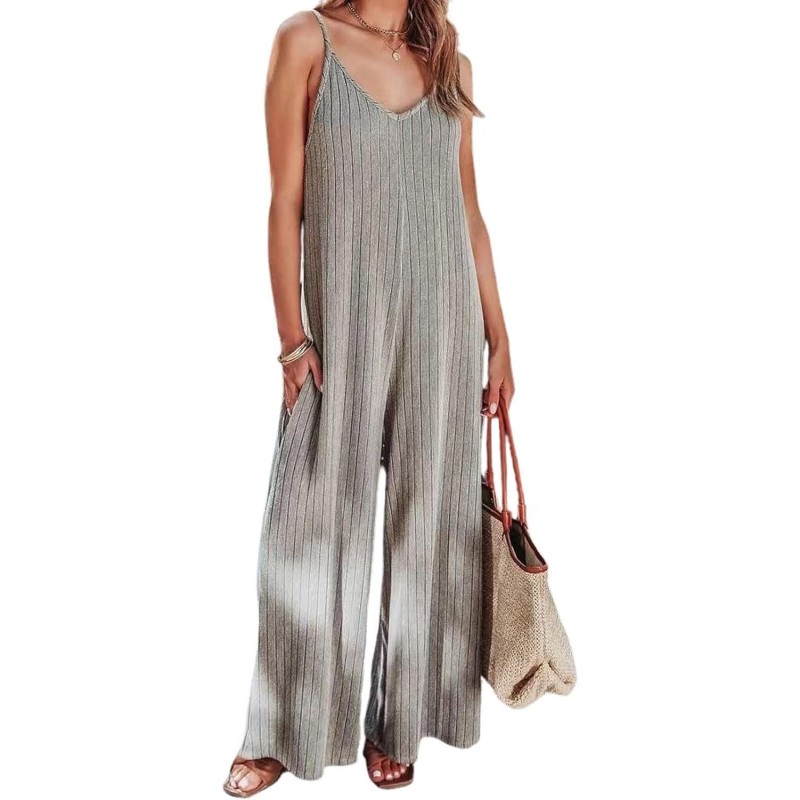 CHARTOU Women’s Summer Jumpsuit Rib-Knit Spaghetti Straps Wide-Leg Long Pants Romper Overalls(Grey)