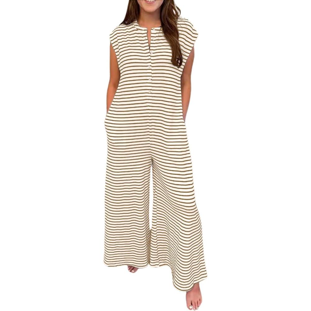 CHARTOU Women’s Summer Loose Stripes Overalls Cap Sleeve One Piece Jumpsuit Buttons Wide Leg Pants Romper(Brown)